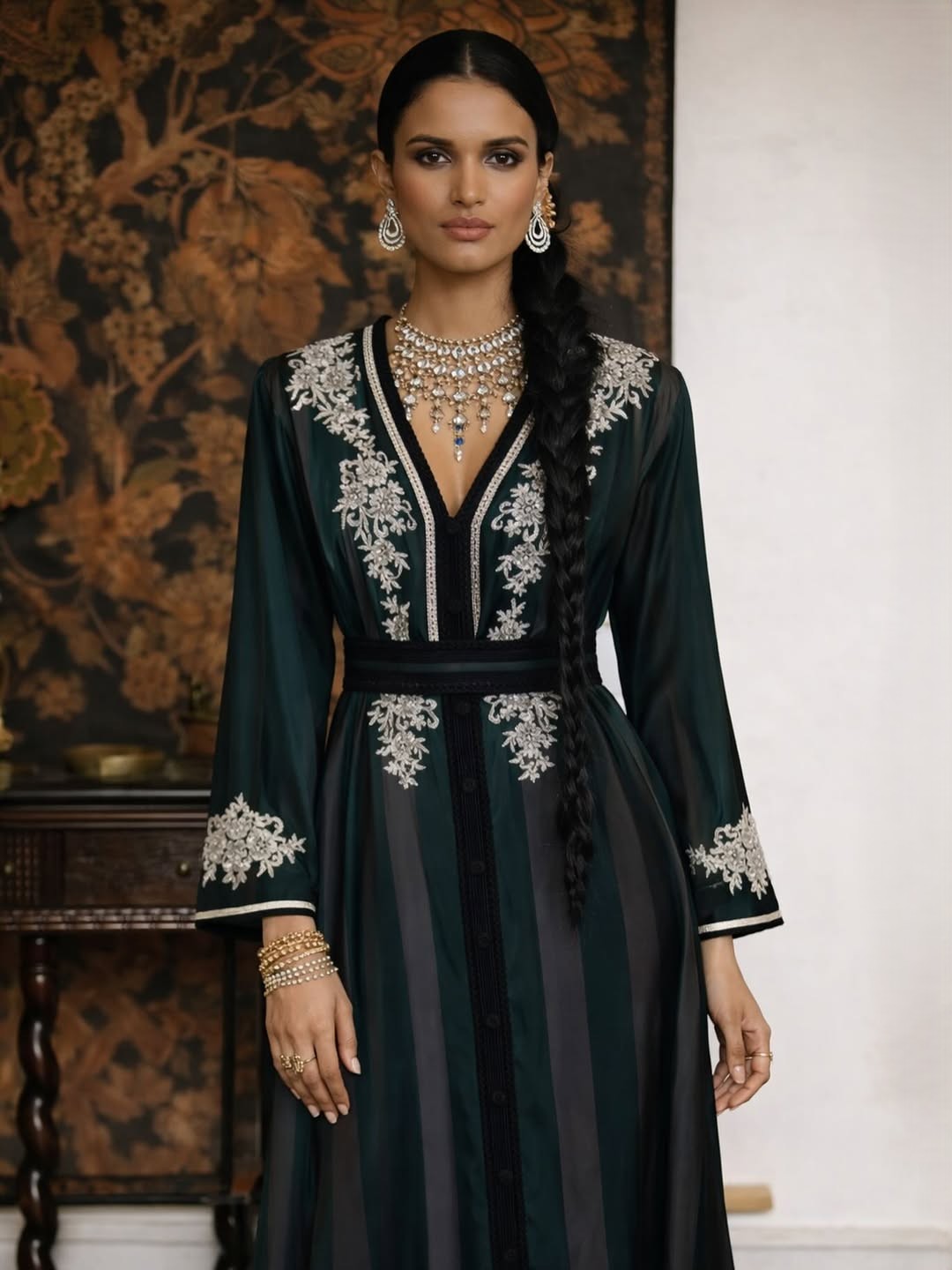 يعتبر هذا القفطان الأسود المنفذ من قماش مخطط بشكل عامودي قمة الروعة، فقماشه متين، وتم تطريزه بخيوط فضية عند الصدر والأكمام، مع الاستعانة بعقد مجوهر من البلاتين والألماس لتزيين محيط العنق المكشوف برقي. وجاءت أقراط الثريا؛ لتتوج هذه الإطلالة المناسبة للحفلات الرسمية ومناسبات الأعراس.