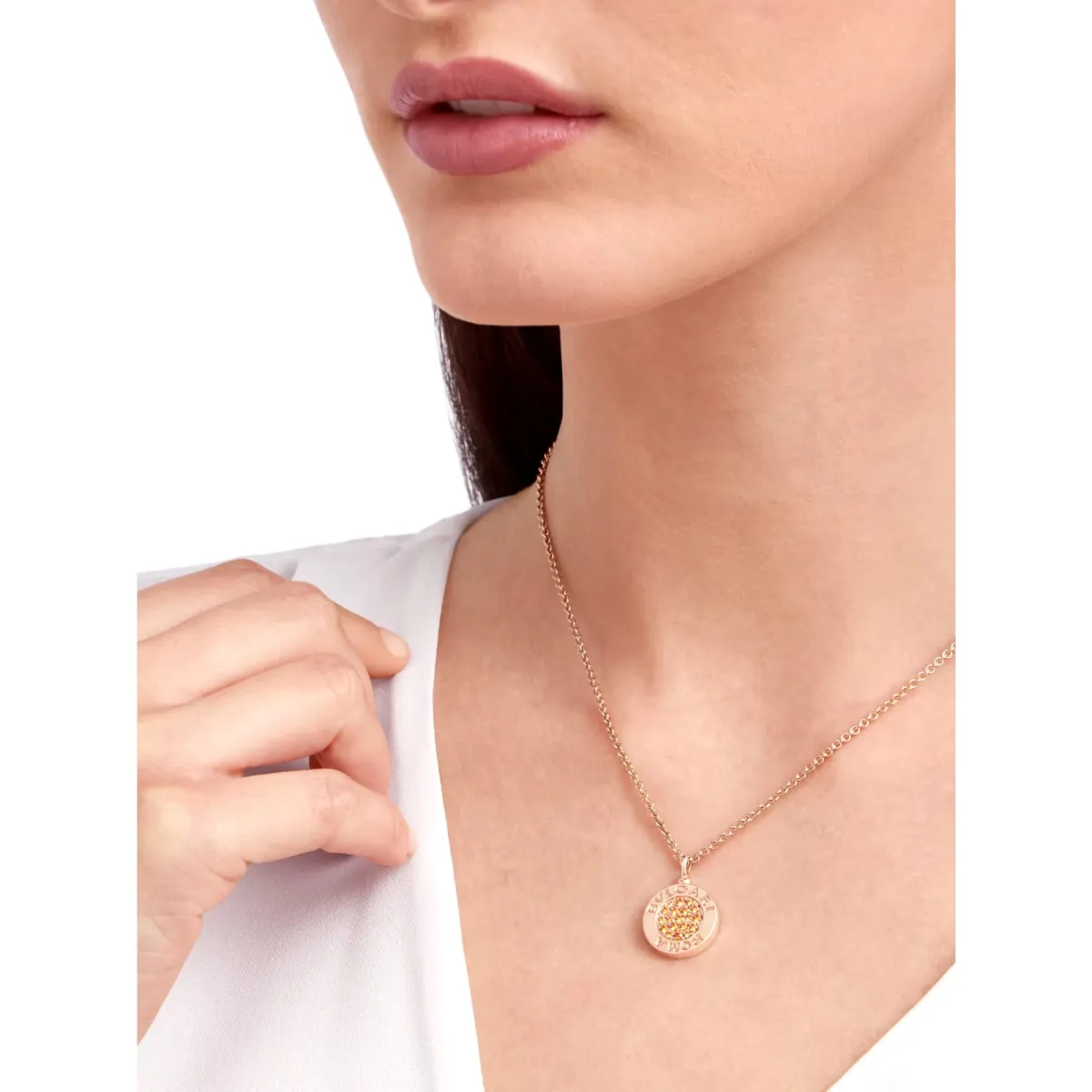 من بلغاري Bvlgari اخترنا لكِ قلادة من الذهب الوردي عيار 18 قيراطاً مستوحى من الجذور الرومانية للدار، ويعبّر عن الاندماج الأنيق بين التراث والحداثة بشعار المجموعة المزدوج الأيقوني الذي يستحضر نقوش الكتابة الدائرية على النقود الرومانية القديمة، ويحيط بقطعة مستديرة من عرق اللؤلؤ الأبيض والألماس وعقيق المندرين.