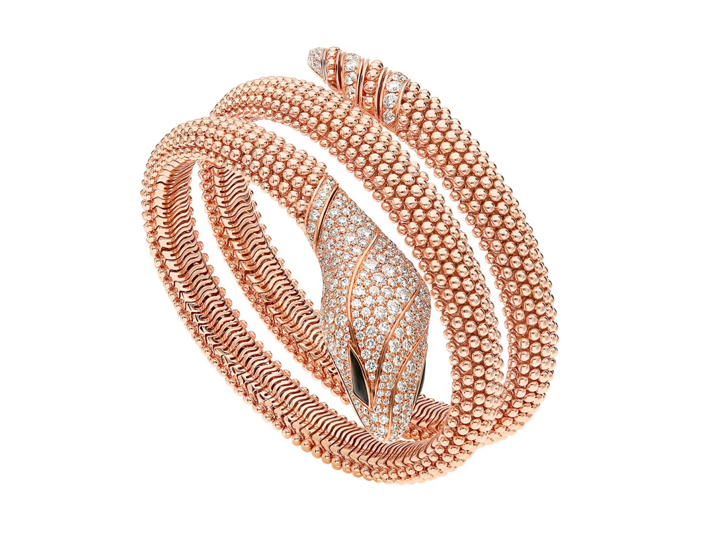 ينضح سوار "سيربنتي" المصنوع من الذهب الوردي عيار 18 قيراطاً، بجاذبية آسرة وخالدة، وهو مصنوع ببراعة من خرزات ذهبية صغيرة متحركة، مما يضفي على القطعة لمسةً من الحركة والجاذبية الحسية، بينما رأسها وذيلها الآسران مرصعان بالألماس المرصوف، في مزيج من الحرفية الفائقة وسهولة الارتداء الرائعة، مصدر قوة وثقة بالنفس، مواكب دائماً للعصر.