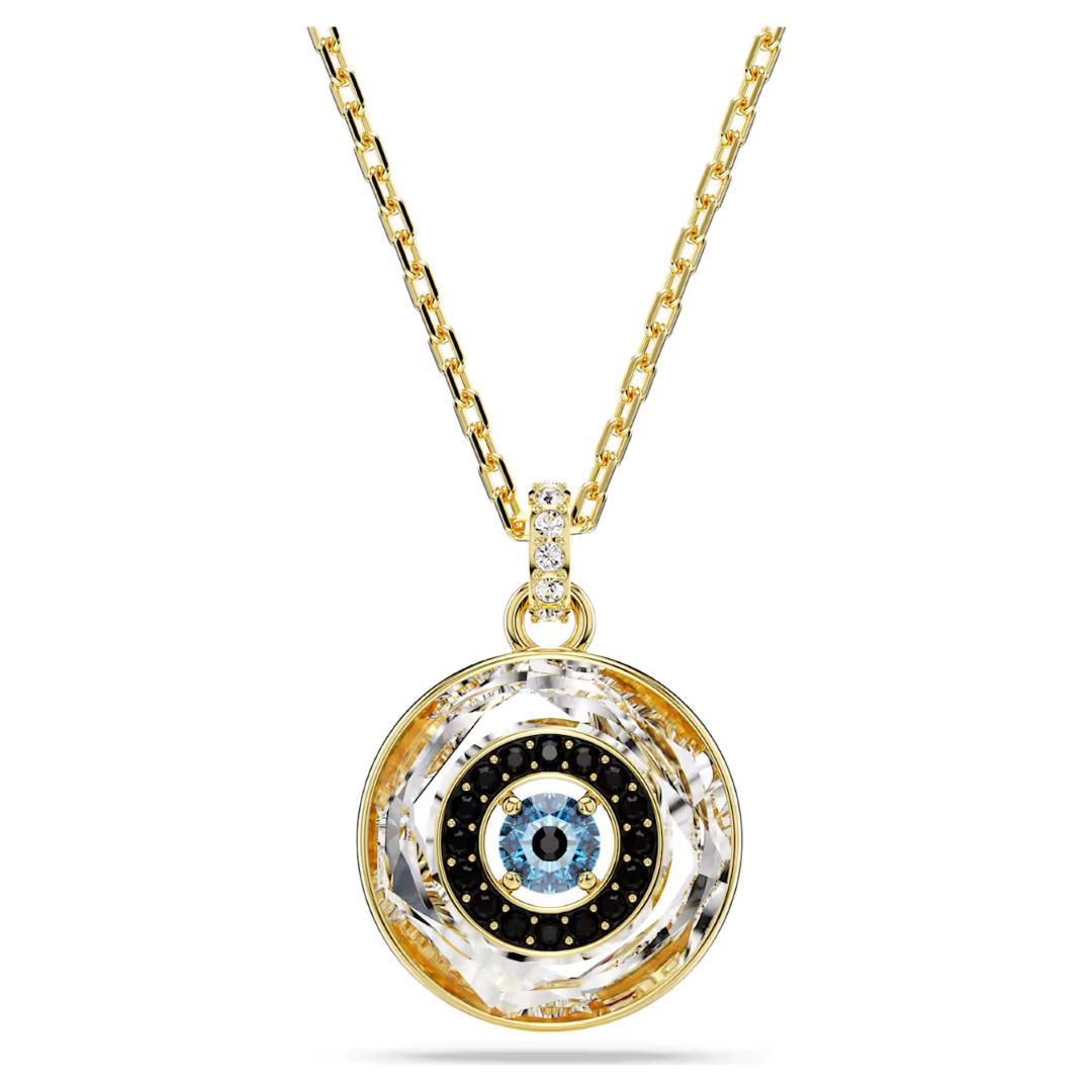 هذه القلادة الآسرة من سواروفسكي Swarovski، تُجسّد خبرة الدار في الصياغة الدقيقة. يتميز التصميم برمز العين الأيقوني؛ مصوغاً في حلقة خارجية مشغولة بقطع كريستالية مسطحة، ومُرصّعاً بتفاصيل بافيه سوداء مع حجر مركزي أزرق، يُضفي عمقاً ولمعاناً متفرّداً.