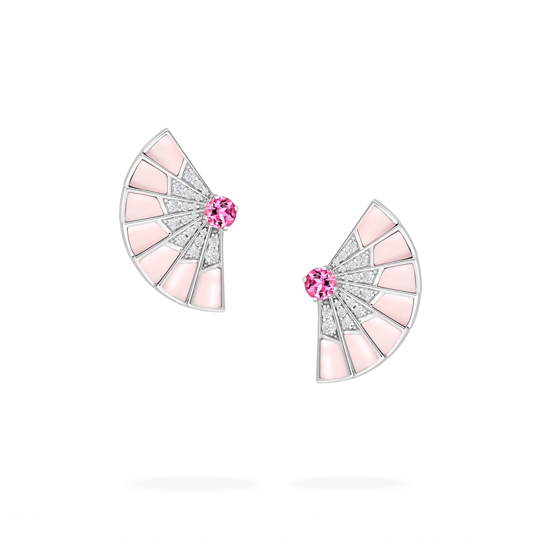 تتألق أقراط Divas' Dream من بولغري Bulgari بالذهب الوردي عيار 18 قيراطاً، مرصعة بأحجار الياقوت الوردي والروبي المستديرة المقطوعة بطريقة براقة، بالإضافة إلى ألماس Pavé متلألئ.