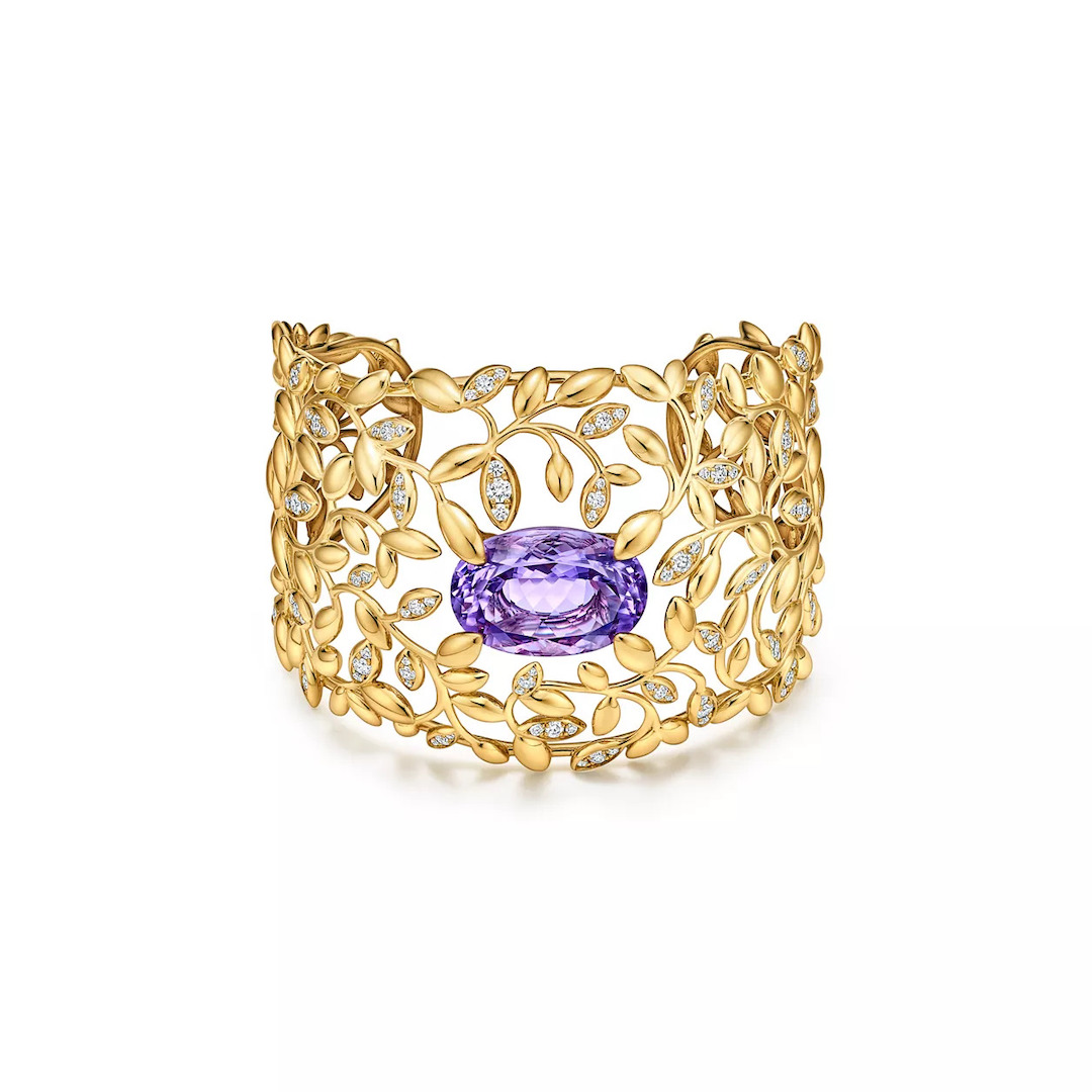 يمثّل سوار Olive Leaf Amethyst من تصميم Paloma Picasso لدار تيفاني آند كو Tiffany & Co رمزاً للسلام والخصوبة، مستلهماً جمال بساتين الزيتون التي تحيط بمنزل المصممة في مراكش، حيث تتحوّل الطبيعة إلى مصدر إلهام دائم لرؤيتها الفنية. يتجسّد هذا الإلهام في تصميم يُصاغ يدوياً بعناية لافتة، مع إبراز جرأة الخطوط ودقّة التفاصيل في كل ورقة زيتون تتدلّى بانسيابية شاعرية فوق المعصم.