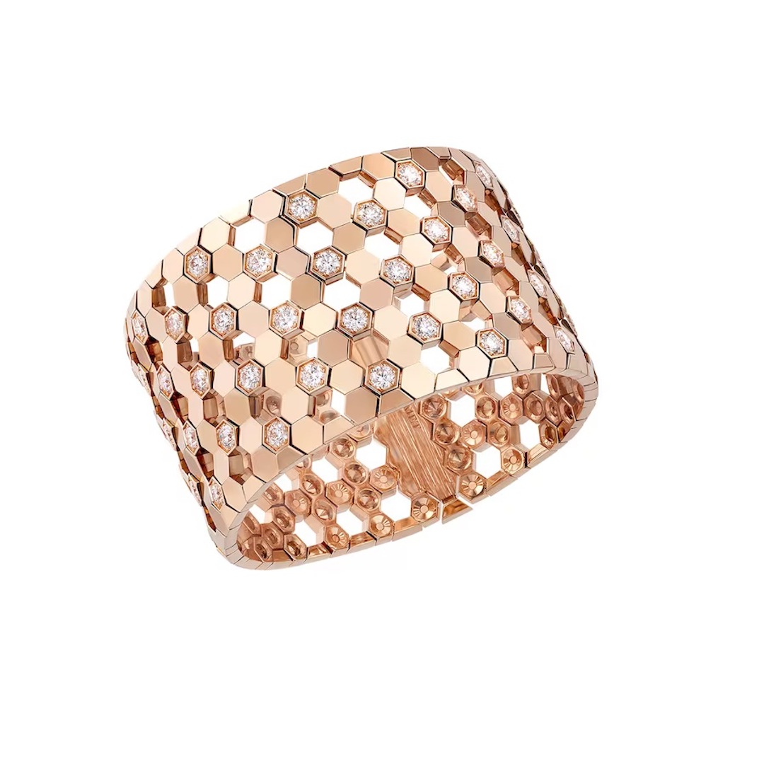 بدرجة متناهية من البراعة، يأتي سوار Bee de Chaumet من شوميه Chaumet كتحفة فنية مرهفة الحركة، حيث صُمّم بمفاصل دقيقة تمنحه ليونة استثنائية تلامس البشرة كطبقة ثانية نابضة بالفخامة. يستلهم السوار شكله من بنية خلية النحل المتقنة، حيث تم تثبيت كل حجر ألماس فيه داخل ترصيع دقيق، ما يضيف إلى التصميم لمسة مضاعفة من الترف والرقي، حيث ترتفع أحجار الألماس قليلاً عن سطح الذهب لتعزيز تألّقها، فتخفي الإعداد المعدني تقريباً وتترك المجال كاملاً لبريق الأحجار.