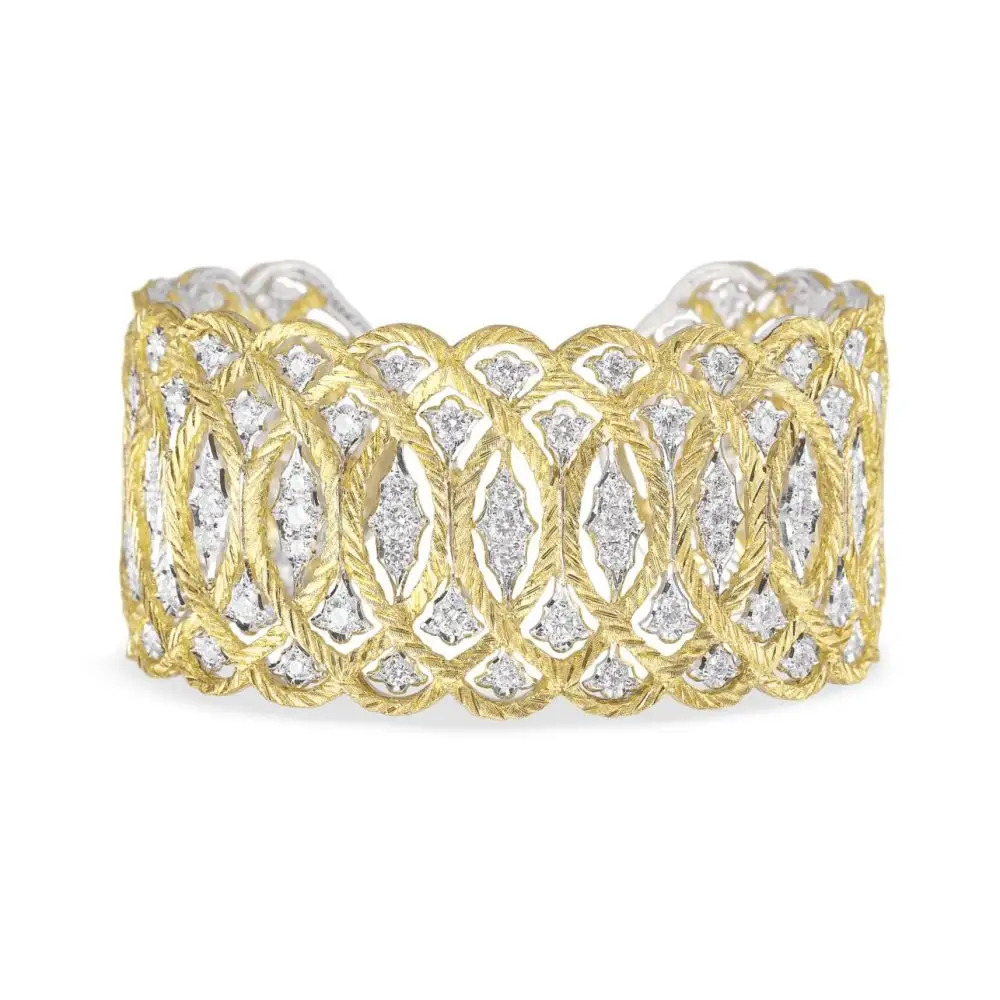 يأتي سوار Étoilée المصنوع من الذهب الأصفر والذهب الأبيض والمرصّع بالألماس من بوتشيلاتي Buccellati كتحفة تتجاوز حدود المجوهرات التقليدية، ليقدّم تجربة فنية متكاملة تنبثق من خيال أندريا بوتشيلاتي المبدع. في هذا التصميم، تتكشّف مجموعة Étoilée Diamonds كقصيدة ضوئية تتراقص فيها الانعكاسات بين دفء الذهب الأصفر ونقاء الذهب الأبيض، بينما ترتقي أحجار الألماس المصقولة إلى دور البطولة عبر بريقها الذي ينساب بانسيابية شاعرية،