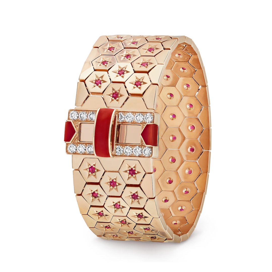 تمت صياغة خلايا السوار من الذهب المصقول بعناية، بالتناغم مع خلايا مرصّعة بالماس، لتتابع على نحو لا نهائي بسلاسة آسرة لا يقطع إيقاعها سوى قفل صغير متخفٍّ بعناية.