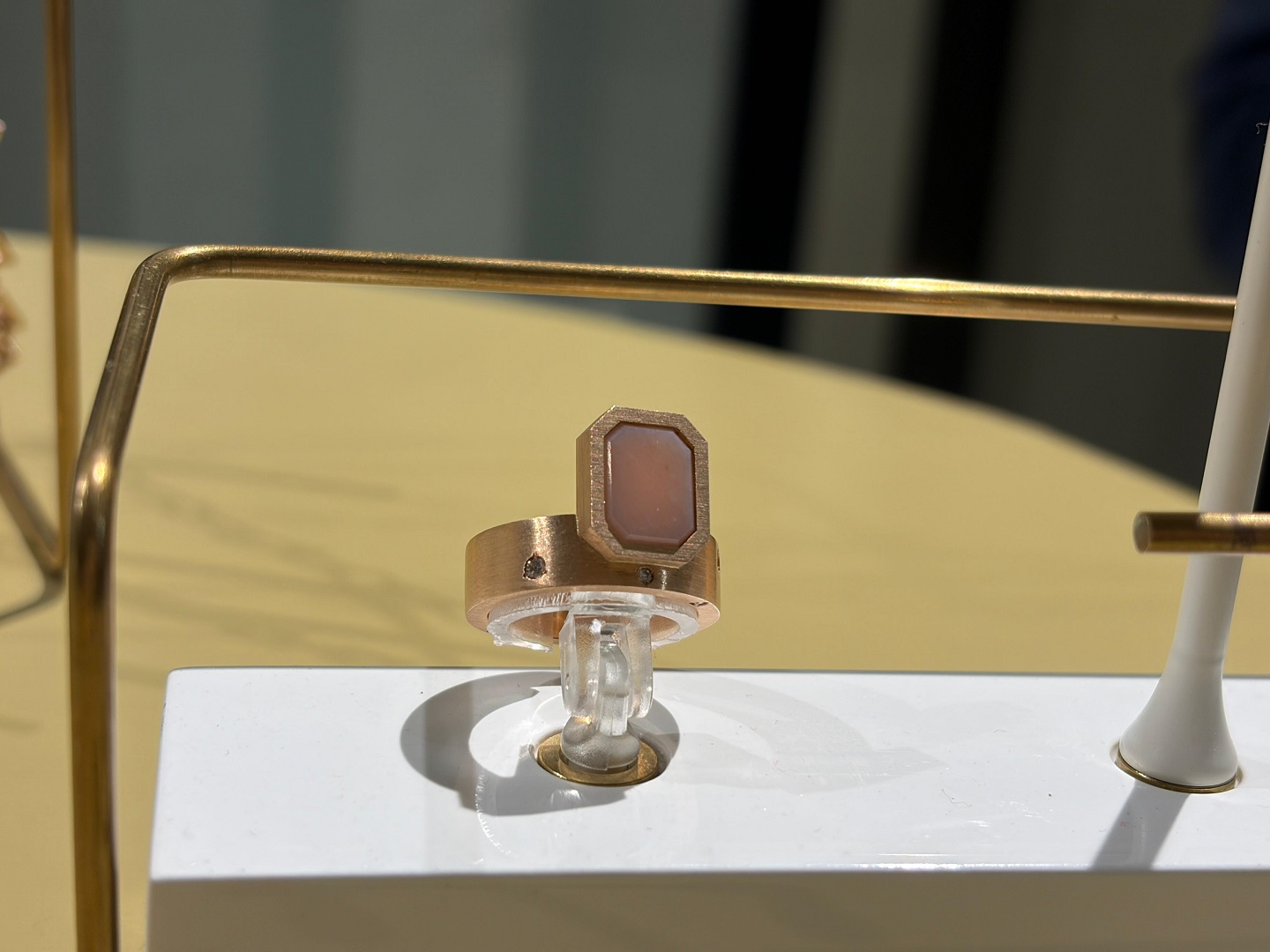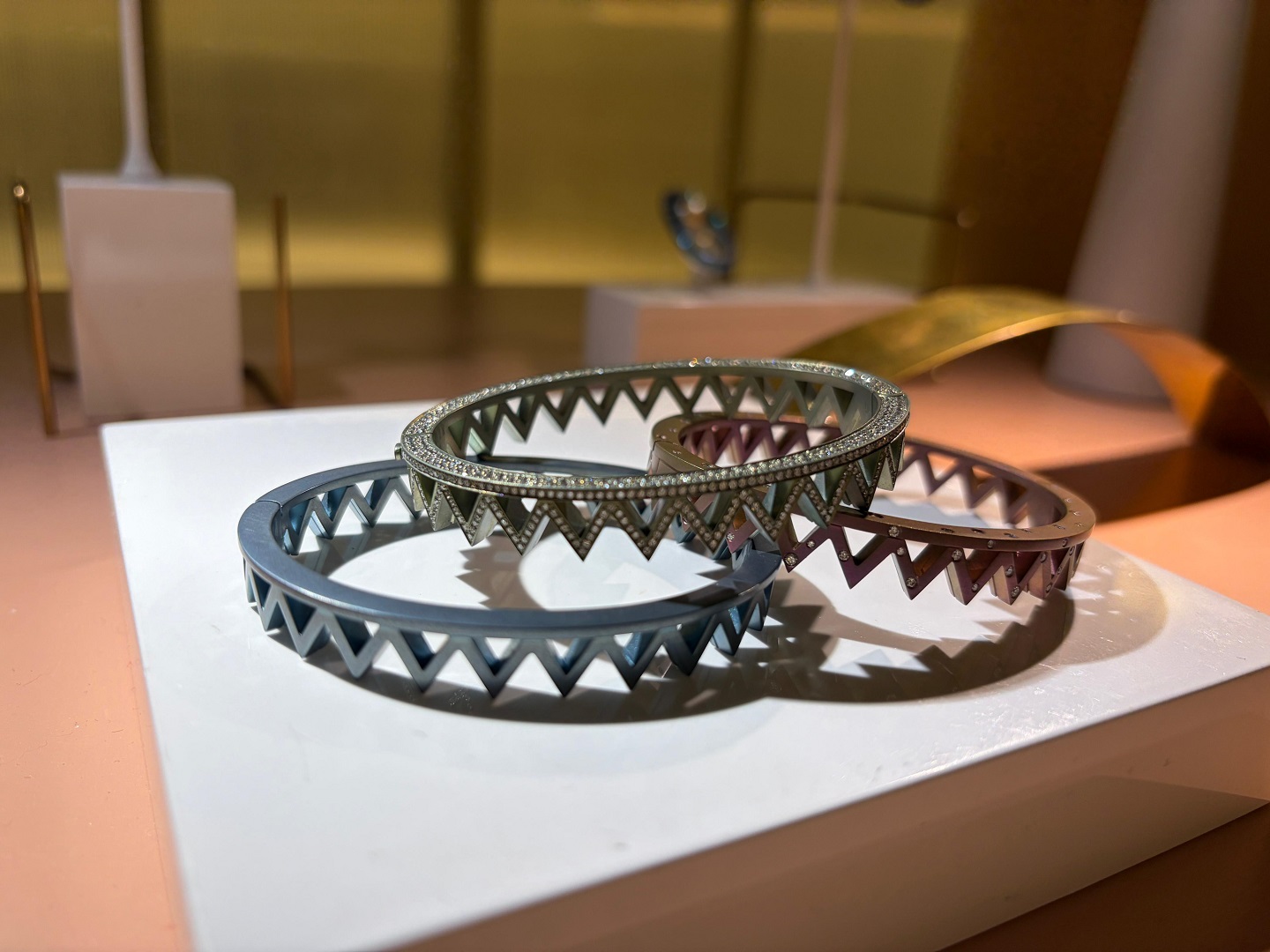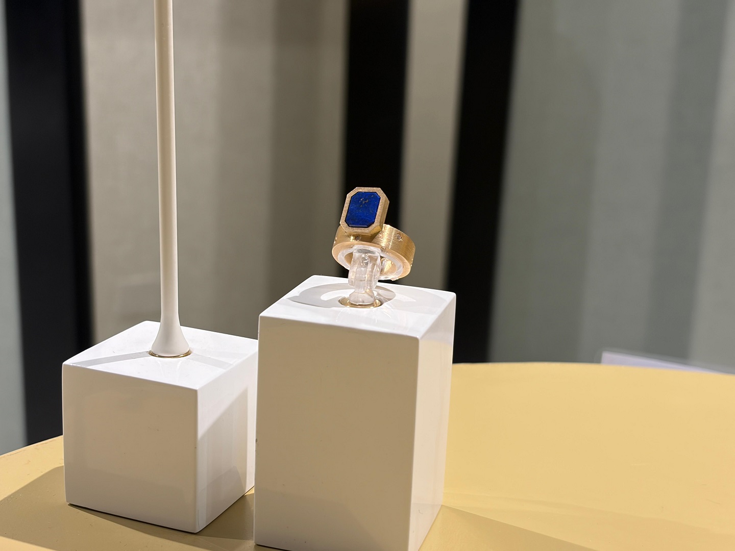 تحدثنا أيضاً مع الأميرة عبير الفيصل، مصممة مجموعة Ain في دار علامة "نون" للمجوهرات، فأخبرتنا عن مجموعتها المميزة، وقالت: "هذه أول مجموعة لي، المجموعة عبارة عن قطع ذات طابع عملي يومي، بأنواع مختلفة من المعادن، مع الأحجار شبه الكريمة، وهي مستوحاة من مباني الرياض بين الحاضر والماضي، بطابعها الصناعي، وقررت أن أقوم بتنفيذ الشكل النهائي للقطع بنمط مطفي؛ ليبرز جمال الأحجار أكثر، واستخدمت أحجار الإيفنتورين مع الذهب الوردي، والملاكيت، مع الذهب الأصفر، ومع التيتانيوم الأسود المطفي"، وأضافت: "أمزجة وتركيبات مختلفة لمناسبات مختلفة؛ فكل شخص له شخصيته وهُوِيَّته، وأنا حاولت أن أقدم تشكيلة واسعة من الألوان والمجموعات حتى يجد كل شخص مراده ضمن القطع".