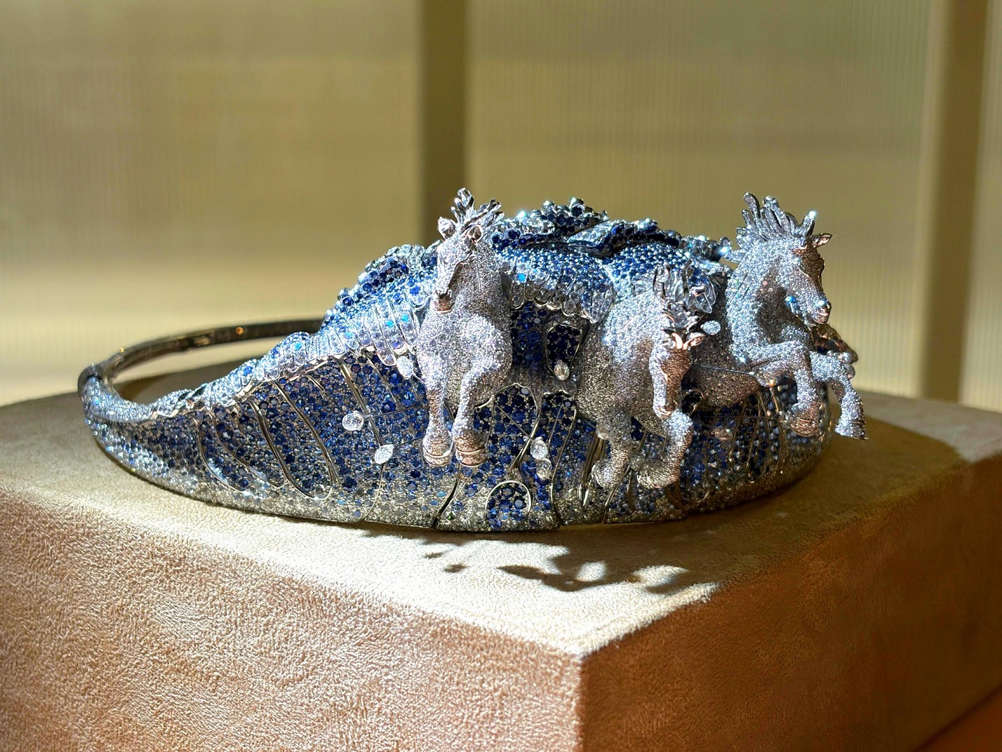 ولكن ما هي قصة هذا التاج؟ تقول الأميرة: "قصة هذا التاج مهمة بقدر جمال تصميمه، كنت حينها مع زوجي في رحلة شهر العسل إلى إندونيسيا، وهناك كنت أنظر إلى الأمواج العالية ولأول مرة أستطيع أن أرى ما يُعرف بـ"الأحصنة البيضاء" داخل تكسر الأمواج، وهذا المنظر ألهمني وقمت برسم تصور أولي للتصميم في اللحظة نفسها، بعدها كنت منشغلة بتصميم أول مجموعة للعلامة في باريس، وسمعت بعض الكلام عن كوني مصممة سعودية وكان هناك تشكيك بخبرتي وقدرتي على الإبداع؛ لذا كان تحدياً بالنسبة لي، ولكنني لا أحب الرد على الكلام بالكلام وإنما بالفعل؛ لذا قررت أن أصمم هذا التاج بالتقنيات الفرنسية الكلاسيكية الخاصة بهم، وذلك حتى أظهر أننا كمصممات سعوديات قادرات على إتقان هذه المهارات في التصميم، ولكن لكي أبين هويتي أصررت أن تكون الخيول في التصميم خيولاً عربية، وهذه نقطة مهمة جداً".