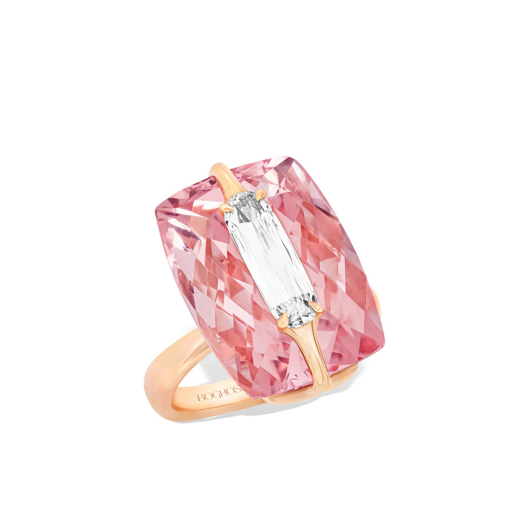 في هذا الخاتم الأنيق من بوغوصيان Boghossian يتداخل حجر من الألماس المستطيل بشكل وسادة براقة مع المورغانيت الوردي النابض بالحياة بقطع الوسادة؛ ليجسّد الخاتم أسلوب الدار المبتكر في تصميم أنيق يبرز تناغم الأحجار وتفرد الحرفة العالية التي تشتهر بها الدار.