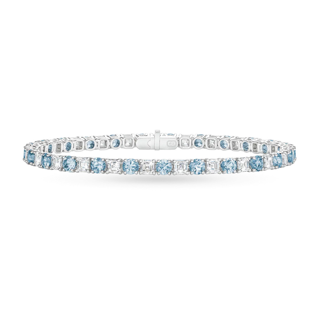 سوار تنس أنيق من الأكوامارين والألماس من هاري وينستون Harry Winston من مجموعة Classics يقدم تناغماً فريداً بين اللون الهادئ للأكوامارين وبريق أحجار الألماس المتألقة، حيث تم تركيب حجر الأكوامارين المستدير وألماس بقطع الزمرد المربع في البلاتين؛ ليبرز تصميماً راقياً يجمع بين الأناقة الخالدة والرقي الذي يناسب جميع المناسبات.