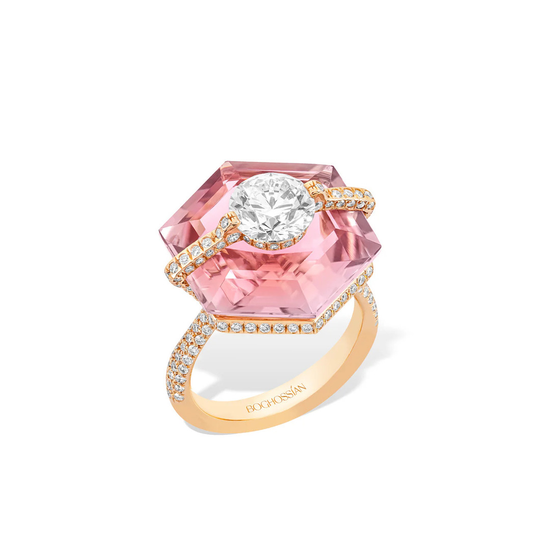 يبرز هذا الخاتم الأنيق براعة دار بوغوصيان Boghossian في استخدام تقنية Kissing المبتكرة، حيث يجلس حجر ألماس دائري الشكل فوق تورمالين وردي سداسي الشكل، وكأنهما يلتقيان في رقصة رقيقة تفيض بالأناقة والأنوثة.
