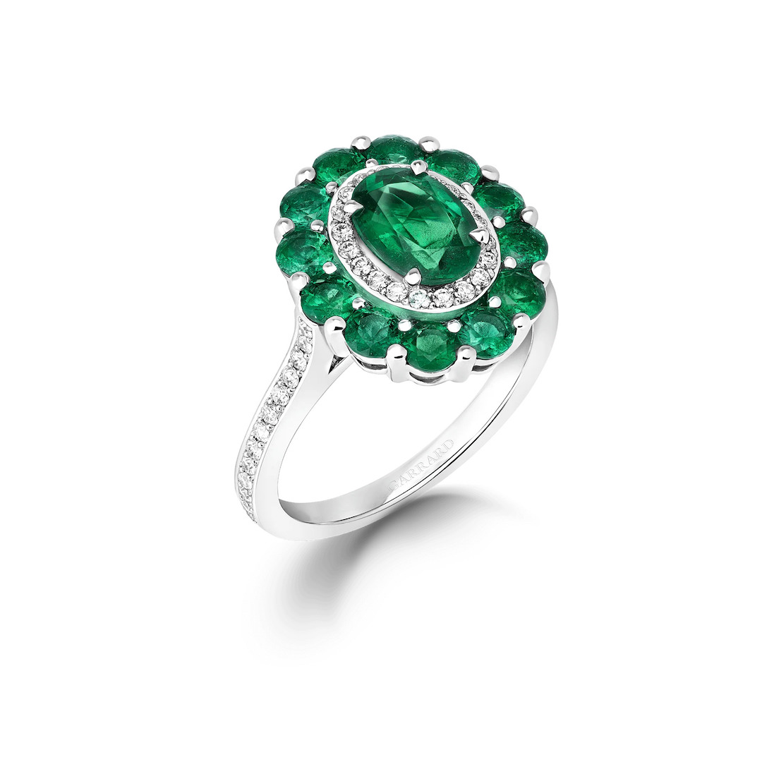 يحافظ خاتم 1735 Double Colour Cluster من غارارد Garrard على جميع التفاصيل الدقيقة للمجوهرات الأصلية 1735 Double Cluster، مواصلاً تكريم خاتم خطوبة الأميرة ديانا الأيقوني، التصميم الذي شكل لحظة تاريخية في عالم المجوهرات. يزداد اللون حيوية وتألقاً من خلال تجمع الزمرد المتلألئ حول الحجر المركزي البيضاوي، مع محيط من أحجار الألماس الدقيقة، وحزام مزين بالألماس يغطي ثلاثة أرباع الخاتم، ليضفي لمسة من البريق على تصميم الدار المميز.