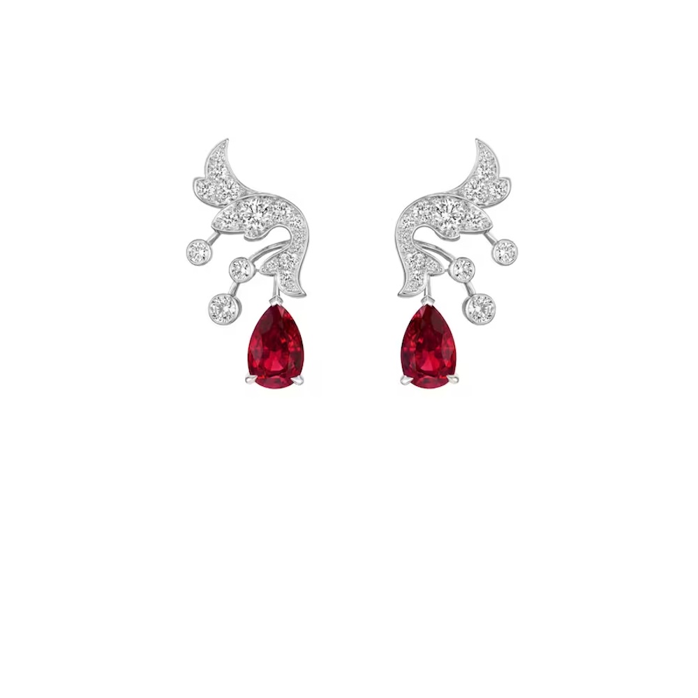 هذه الأقراط من شوميه Chaumet تأتي مصنوعة من الذهب الأبيض، ومزينة بزوج من أحجار الياقوت على شكل كمثرى، يزن كل منها نحو قيراط واحد، مع أحجار ألماس قطع البريانت.