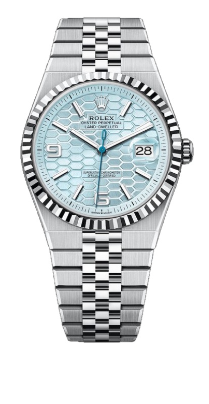 من بين التفاصيل التي لفتتني خلال أسبوع دبي للساعات، كان ظهور لون جديد على عدد من الموانئ، هو لون الأزرق الفاهي. هذا التدرُّج الهادئ ظهر بوضوح في مينا ساعة Rolex Land-Dweller 40 المصنوعة من البلاتين، والتي تأتي بمينا حصري بدرجة Ice-Blue مزين بنقش قرص العسل المتقن، مع 10 أحجار ألماس مقطوعة على شكل باغيت؛ مما يعكس مستوًى عالياً من الدقة والحِرفية داخل معامل العلامة.