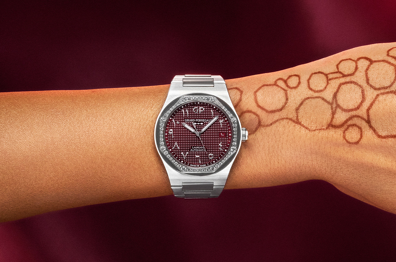 يبدو أن اللون البرغندي لم يغزُ الملابس والحقائب فقط هذا الموسم؛ فمن بين الألوان التي ظهرت بقوة هذا الموسم بعد الأزرق الفاهي، هو لون الميناء البرغندي بدرجاته المختلفة. وهو لون أضاف حضوراً دافئاً وواضحاً على عدة ساعات جديدة. مثلاً استخدمته Girard-Perregaux في إصدار Laureato UAE Edition بمينا محفور يعزز عمق اللون وملمسه. ومع الأرقام العربية والإطار المرصّع بالألماس، بدت الساعة كتحفة فنية.