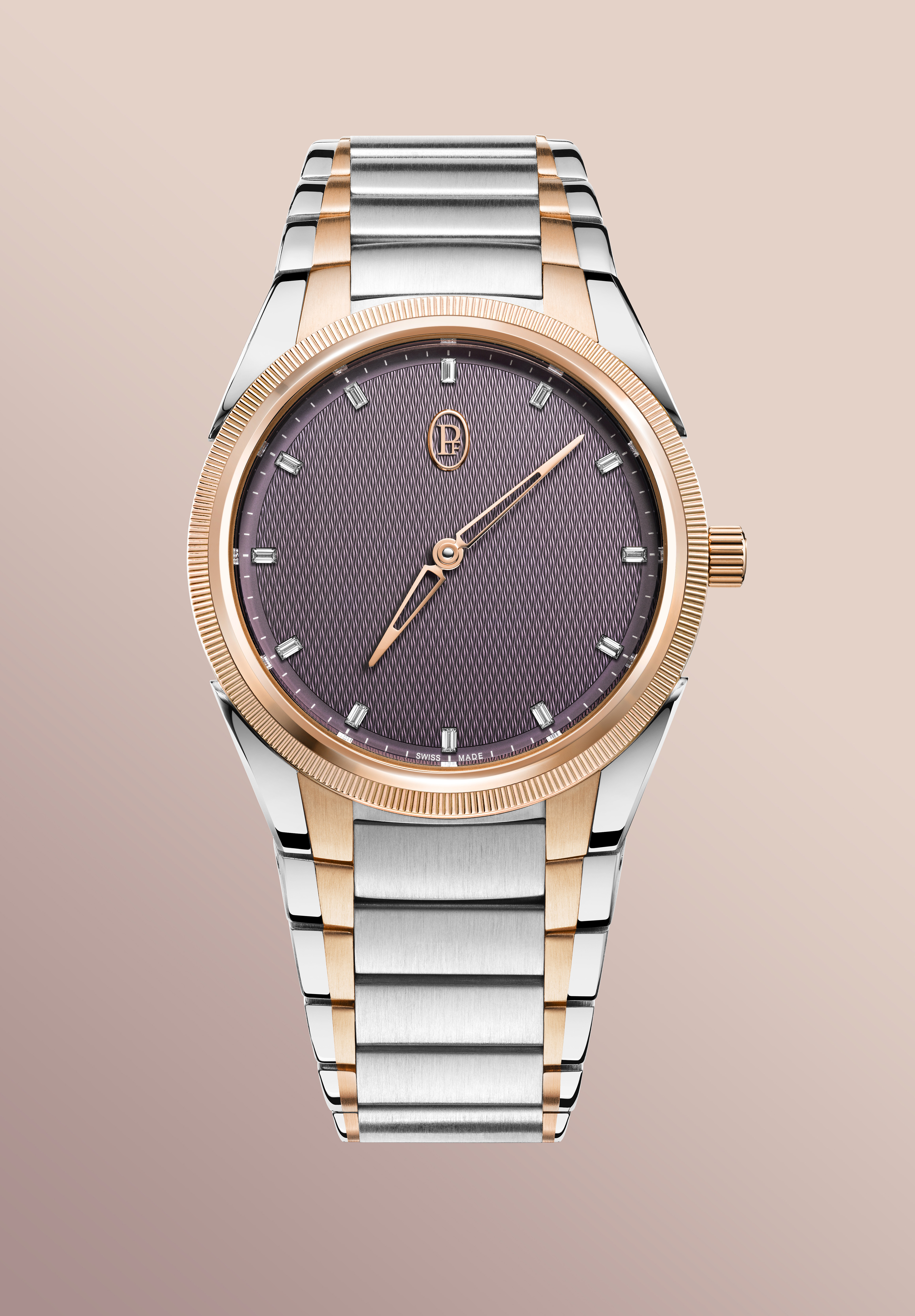 وتأتي أيضاً ساعة Parmigiani Fleurier TONDA PF كتطوُّر جديد لطرازها الذي فاز بجائزة GPHG لعام 2022 بقياس 36 مم؛ حيث تقدّم الدار هذا الإصدار المصنوع من الفولاذ والذهب الوردي عيار 18 قيراطاً، كتجسيد واضح لفلسفتها في الفخامة الهادئة. أكثر ما يميّز الساعة هو ميناها بلون Deep Ruby العميق، مع مؤشرات ألماس مقطوعة على شكل باغيت؛ مما يمنحها توازناً رائعاً بين الأناقة العصرية والطابع الراقي المتقَن.