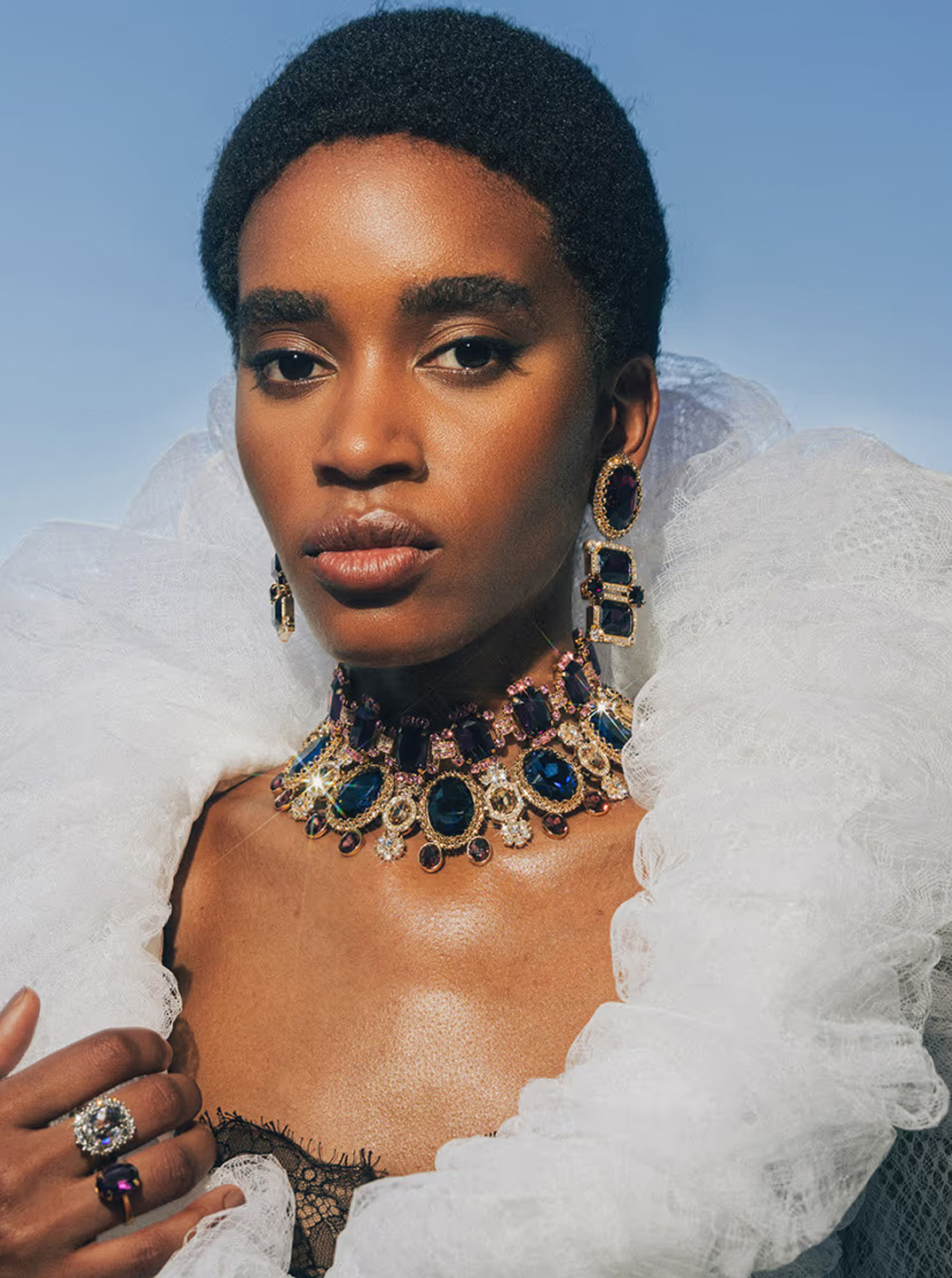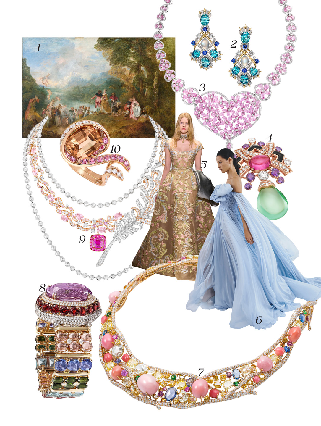 في عالمِ الروكوكو، وُلِدَت الرهافةُ من تزاوجِ المعادنِ مع الأحجارِ الكريمة فاتحةِ الألوان. مزيجٌ من التوبازِ الأصفر، والعقيقِ الوردي، والسترين اللامع، يرقصُ على ملامحِ الضوءِ مثل غيمةٍ حالمةٍ، ويفيضُ ببهجةِ الحياة، وغنى الروح.