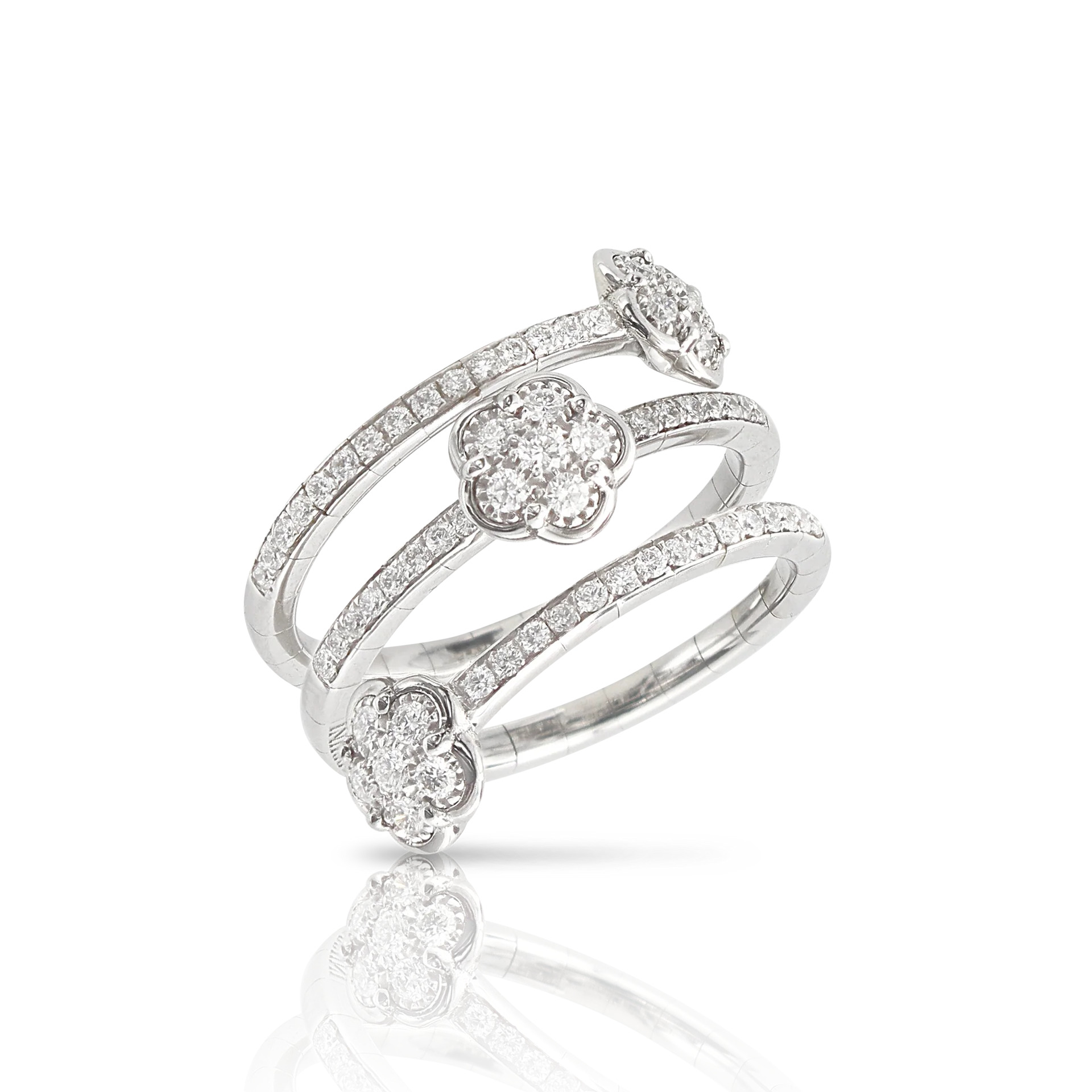 مجموعة Figlia dei Fiori هي مجموعة مكرسة كتحية للروح الأنثوية المبدعة والحرية، بتصاميم زهور تعانق الجسم بكل رقة. الخاتم يأتي مفتوحاً ومرصوفاً بأحجار الألماس تتناثر على حلقاته 3 زهرات ناعمة مرصعة بالكامل بالألماس.