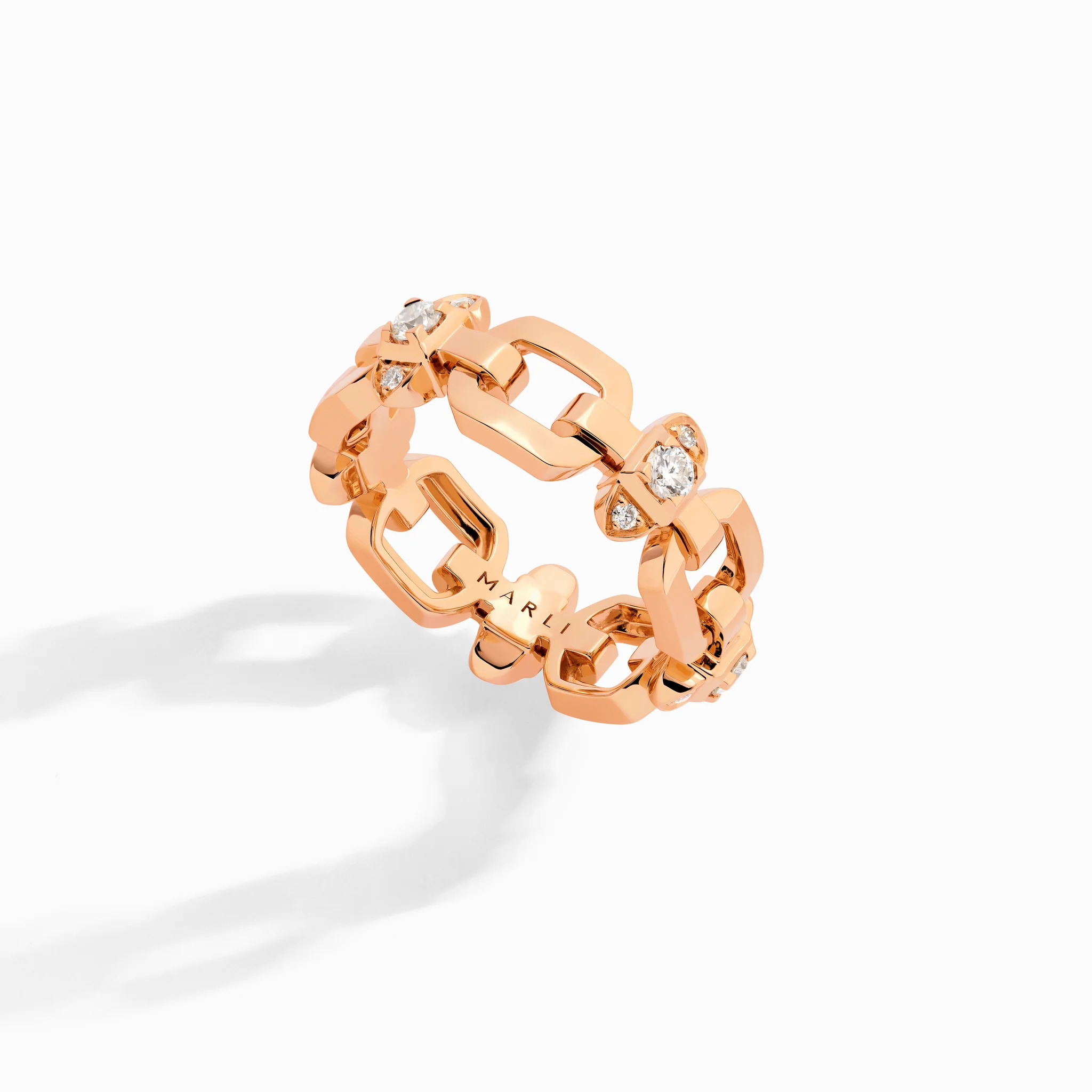 صُنع هذا الخاتم بإتقانٍ عالٍ من الذهب الأصفر عيار 18 قيراطاً، ويتميز بتفاصيل ألماسية إضافية مرصّعة ضمن تصميم هرمي يمنحه بُعداً هندسياً لافتاً. وقد استُلهم هذا التصميم لامرأة MARLI New York التي تجسّد رقيّها الخاص، وأناقتها المتفرّدة، وقوّة حضورها الآسر.