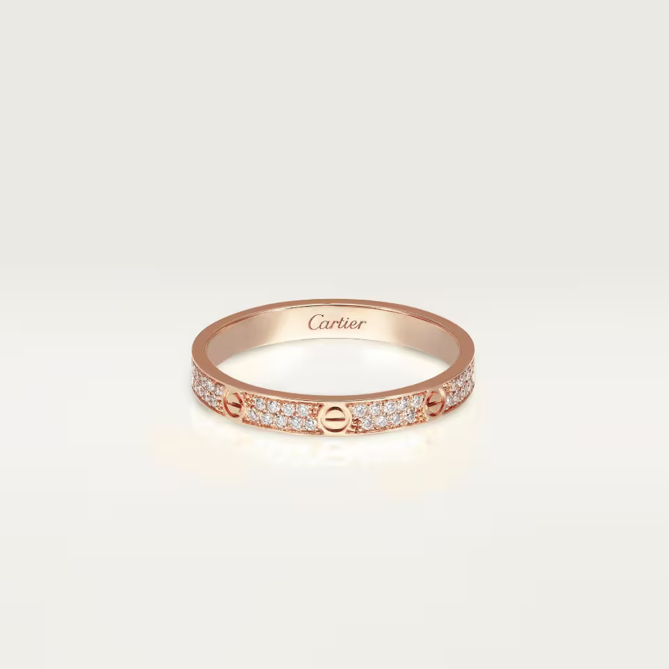 بدأت مجموعة LOVE من كارتييه مع السوار الأيقوني الذي أبصر النور في نيويورك عام 1969. كان ذلك السوار تعبيراً جريئاً عن رؤية كارتييه التصميمية، فهو سوار بيضاوي الشكل يمكن التعرّف إليه فوراً من خلال المسامير الظاهرة التي شكّلت ثورة في عالم تصميم المجوهرات آنذاك. الخاتم مصنوع من الذهب الوردي بتصميم السوار نفسه بمساميره البارزة، وقد رصف بالكامل بأحجار الألماس البراق.