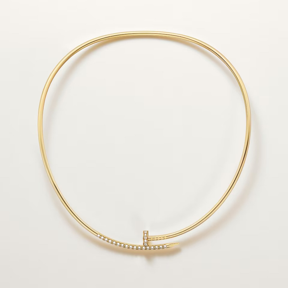 يأتي عقد Juste un Clou تورك مصنوعاً من الذهب الأصفر ومرصّعاً بـ23 حجر ألماس مثبتة بأسلوب الترصيع المقلوب، بإجمالي وزن 0.74 قيراط، ما يمنح القطعة بريقاً هادئاً وأناقة غير تقليدية تعكس روح الجرأة الراقية التي تشتهر بها كارتييه. يلتف هذا العقد حول العنق بانسيابية، ليشكّل توقيعاً أسلوبياً جريئاً ينسجم مع الإطلالات اليومية، كما يضفي لمسة عصرية فاخرة على المناسبات الخاصة.