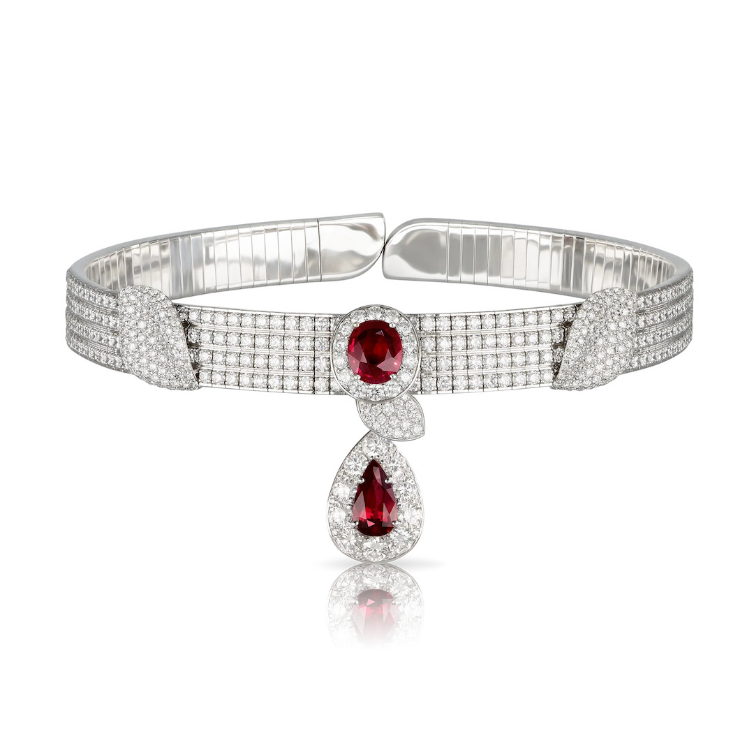 يقدم هذا العقد الفاخر، المصنوع من الذهب الأبيض عيار 18 قيراطاً، توليفة استثنائية من حجر الياقوت الأحمر البيضاوي بمقاس 7×9 مم، وألماس أبيض بوزن إجمالي 12.63 قيراط، مع قلادة متدلية من الياقوت بمقاس 6×11 مم. يتألف العقد من قطعتين متكاملتين تشكلان معاً لوحة فنية من الفخامة والرمزية.