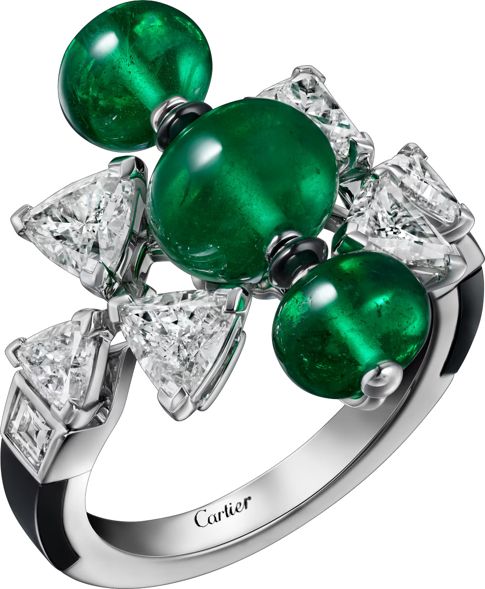 يُعتبر هذا الخاتم من كارتييه Cartier تحفة راقية مصنوعة من الذهب الأبيض عيار 18 قيراطاً، ويجمع بين أناقة الأحجار الكريمة والجرأة التصميمية. يتميز الخاتم بمزيج متناغم من الأونيكس و3 خرزات من الزمرد، بالإضافة إلى 6 أحجار ألماس بوزن إجمالي 1.83 قيراط وحجري ألماس مربعين بوزن إجمالي 0.20 قيراط؛ لتتجسد بذلك فلسفة التوازن والدقة في كل تفصيلة.