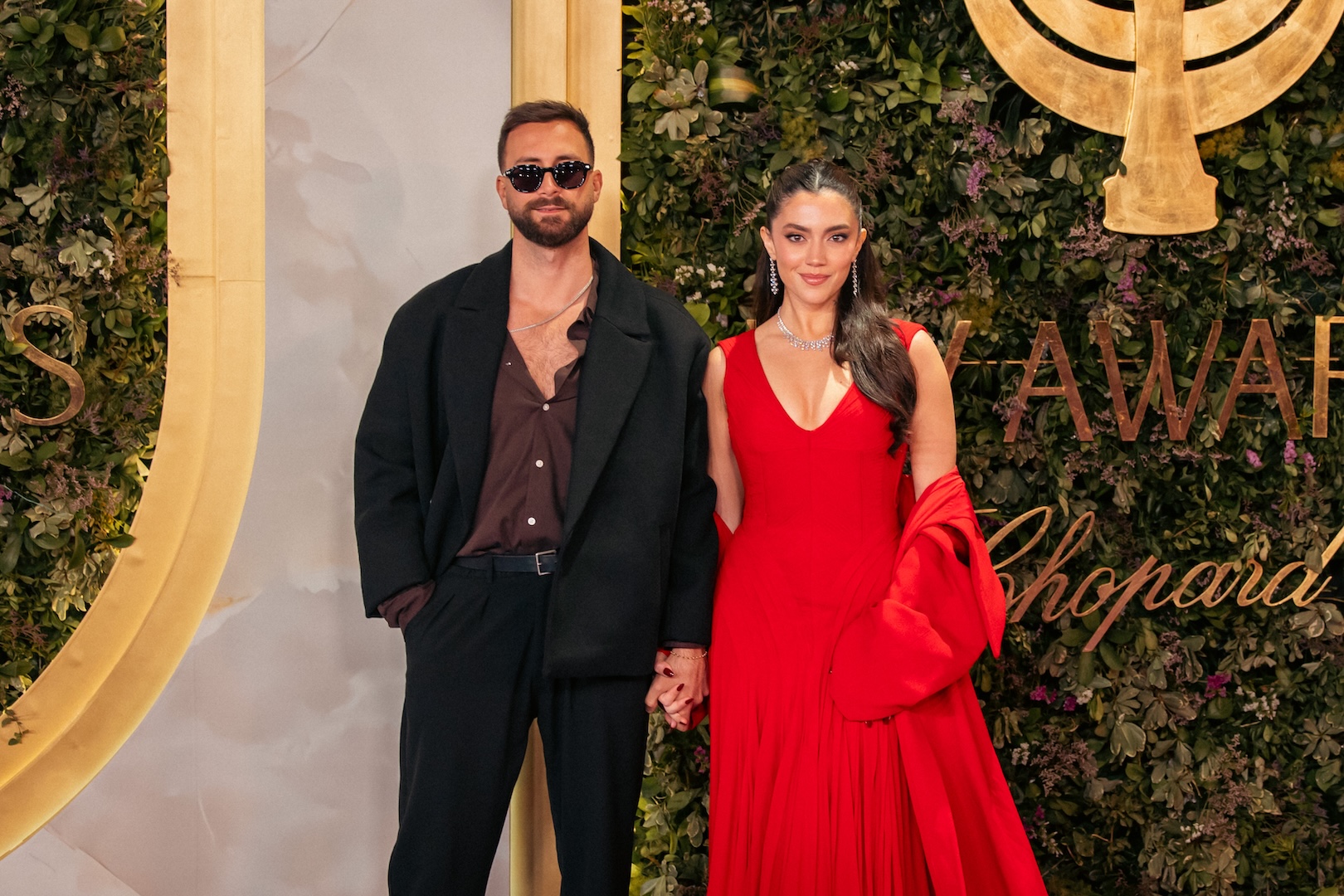 ولإكمال إطلالتها، ارتدت مجوهرات من دار كارتييه Cartier وتحديداً من مجموعة Grain de Cafe المستوحاة من حبوب القهوة، والمصنوعة من الذهب الأصفر عيار 18 قيراطاً والمرصعة بالألماس، وضمت القطع التي اختارتها رزان لإكمال إطلالتها، خاتم كوكتيل وسواراً وأقراطاً، بالإضافة إلى ساعة ذهبية من مجموعة Baignoire من تصميم الدار.