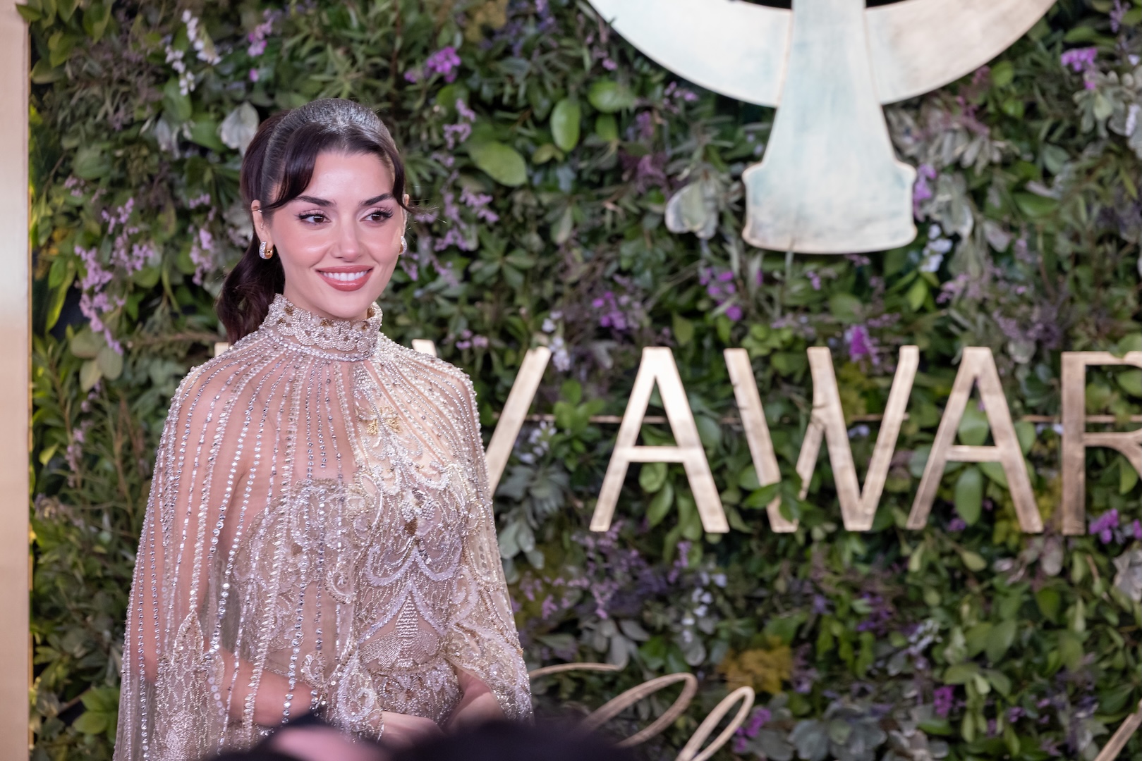 النجمة هاندا أرتشيل سحرتنا بإطلالتها في حفل توزيع جوائز Joy Awards لعام 2026؛ حيث اختارت فستاناً من الدانتيل المطرّز والمرصّع، مع كاب طويل أضفى على إطلالتها فخامة شديدة. ولأن فستانها كان غنياً بالتفاصيل واحتوى على ياقة عالية مطرّزة ومرصّعة؛ فقد اكتفت الممثلة التركية بزوج من الأقراط الحلَقية الناعمة المصنوعة من الذهب والمرصّعة بالألماس؛ لكي تحافظ على توازن إطلالتها