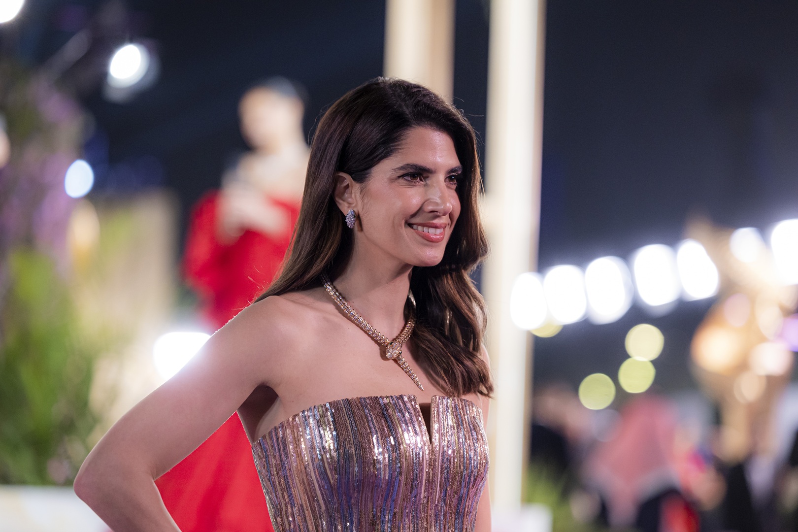 نسقت إلهام علي مع هذه الأقراط عقدَ تشوكر ألماسياً مفتوحاً بنفس التصميم الهندسي الجذاب، مع خواتم ألماسية مُفرغة تلألأت بأناقة، وألقت الضوء على فستانها الوردي المُصمم من التول والكريستال البرّاق.