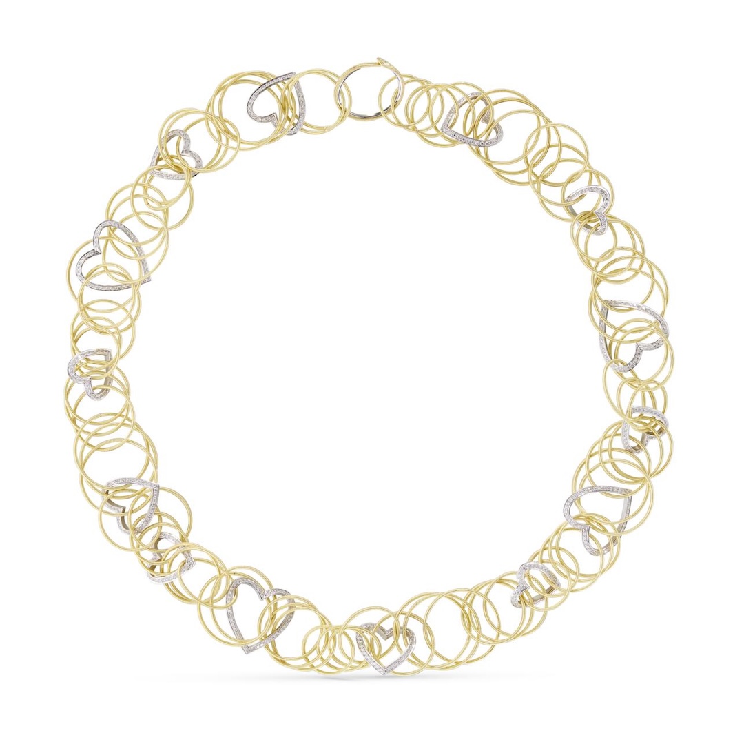 صُنع هذا العقد القصير من مزيج متناغم من حلقات من الذهب الأصفر والذهب الأبيض، ورصع بأحجار ألماس براقة، لتمنحه إشراقاً ناعماً وأناقة راقية.
