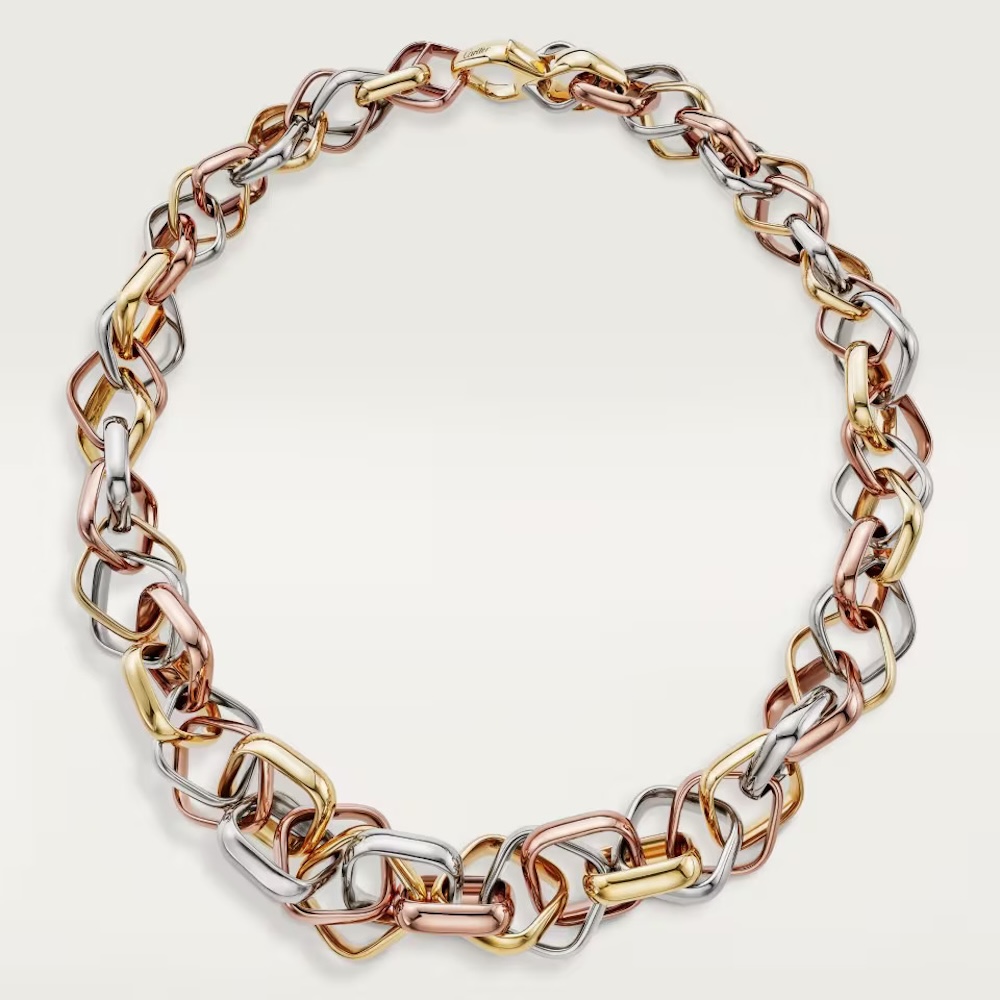 في نسخته المعاصرة ذات الحجم الكبير، يأتي عقد Trinity Cushion ليعكس هذا الإرث العريق بأسلوب جريء وعصري، يمنح الإطلالة لمسة من الفخامة اللافتة والحضور القوي. بتصميم جنزير عريض تمتزج فيه ثلاثة ألوان من الذهب بتناغم مثالي: الذهب الأبيض الأنيق، والذهب الوردي الدافئ، والذهب الأصفر الكلاسيكي، في تعبير راقٍ عن التوازن بين الرقي والحداثة.