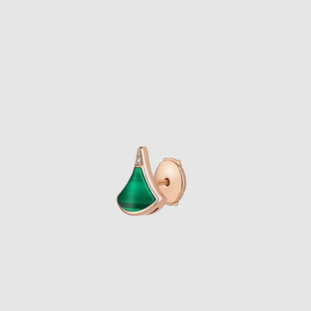 وصُنع القرط من ذهب وردي عيار 18 قيراطاً، وجاء مرصعاً بحجر الملكيت الأخضر الذي يضفي عمقاً لونياً لافتاً، إلى جانب ألماس مرصوف بأسلوب Pavé يمنحه بريقاً ناعماً وأنيقاً، ويتميّز هذا التصميم بإمكانية تنسيقه بشكل منفرد أو مزجه مع أقراط أخرى من المجموعة نفسها، ما يمنح حرية في ابتكار إطلالة شخصية متجددة.