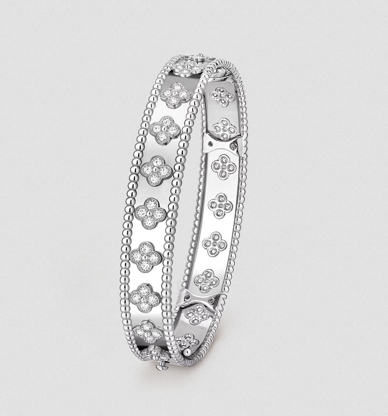 إليك كذلك سوار بيرليه كلوفرز من فان كليف أند آربلز الذي يزدان بحلى زخرفية ثمينة على شكل زهرة البرسيم كما أنه مؤطر بحبات مستديرة من الجانبين، السوار مشغول من الذهب الأبيض ومطلي بالروديوم 18 قيراطاً، كما أن أزهار البرسيم مرصعة بـ 80 حجر ألماس بوزن 1.78 قيراط.