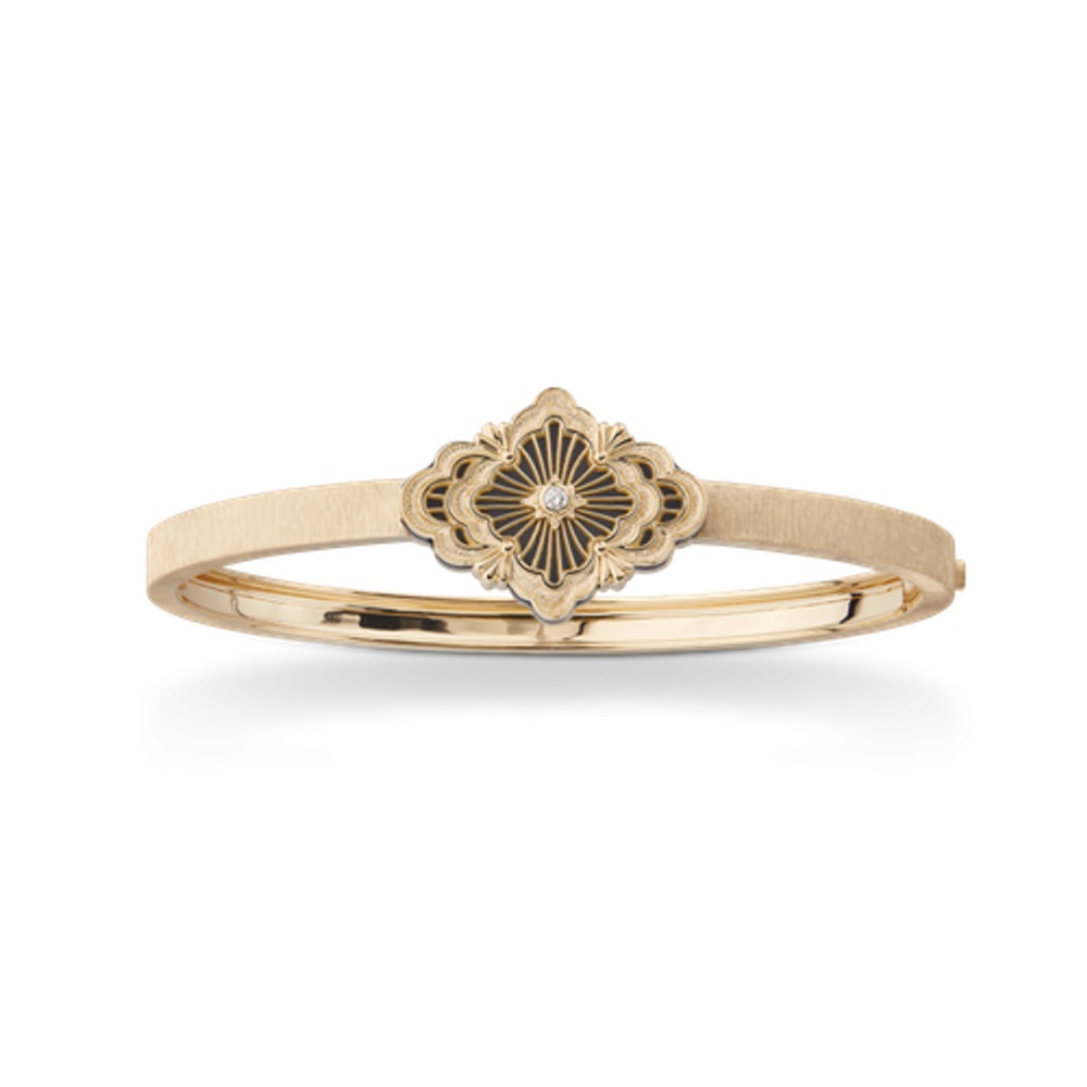 من الأساور الناعمة أيضاً والتي تليق بالإطلالات الرمضانية هو سوار أوبرا تول من بوتشيلاتي، السوار مشغول من الذهب الأصفر ومرصّع بحجر الأونيكس وماسة مركزية بأسلوب البافيه يتوسطها جزء مشغول من الذهب الأصفر على شكل مُعين.