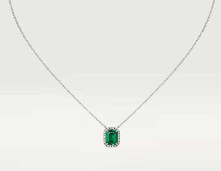 دعينا نبدأ مع حجر الزمرد المعروف بلونه الأخضر العميق، فهو من ناحية يعكس الهدوء والفخامة ومن ناحية أخرى يرتبط بالطبيعة والسكينة التي تشبه أجواء الشهر الكريم، بكل تأكيد يمكنك تنسيقه مع إطلالاتك الرمضانية ذات الألوان الفاتحة مثل الأبيض والبيج، كما يبرز جماله مع العبايات الداكنة كالأسود والكحلي والبني، إذ يخلق تبايناً غنياً وأنيقاً، ما يجعله خياراً مثالياً للإطلالات الرمضانية التي تجمع بين الوقار والفخامة، سواء في النهار أو خلال السهرات المسائية. وعليه اخترنا لك قلادة "كارتييه دِستينيه" المرصّعة بحجر من الزمرّد بقطع زمرّدي والمُحاط بالألماس قطع بريانت، القلادة مصنوعة من الذهب الأبيض.