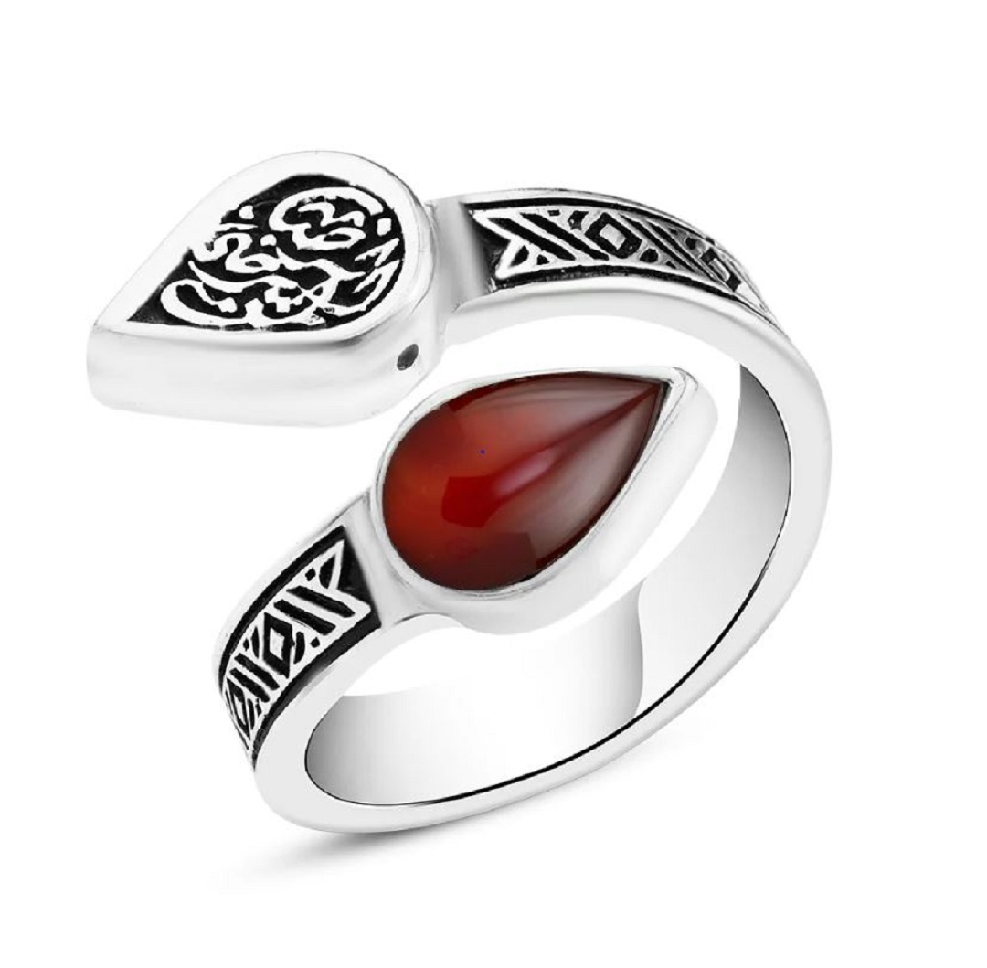 وصُمم الخاتم من الفضة عيار 925 بتصميم مفتوح أنيق، يتخذ شكل قطرتين متقابلتين، يتوسط إحداهما حجر طبيعي باللون الأحمر يمنح القطعة لمسة دافئة وحضوراً لافتاً.