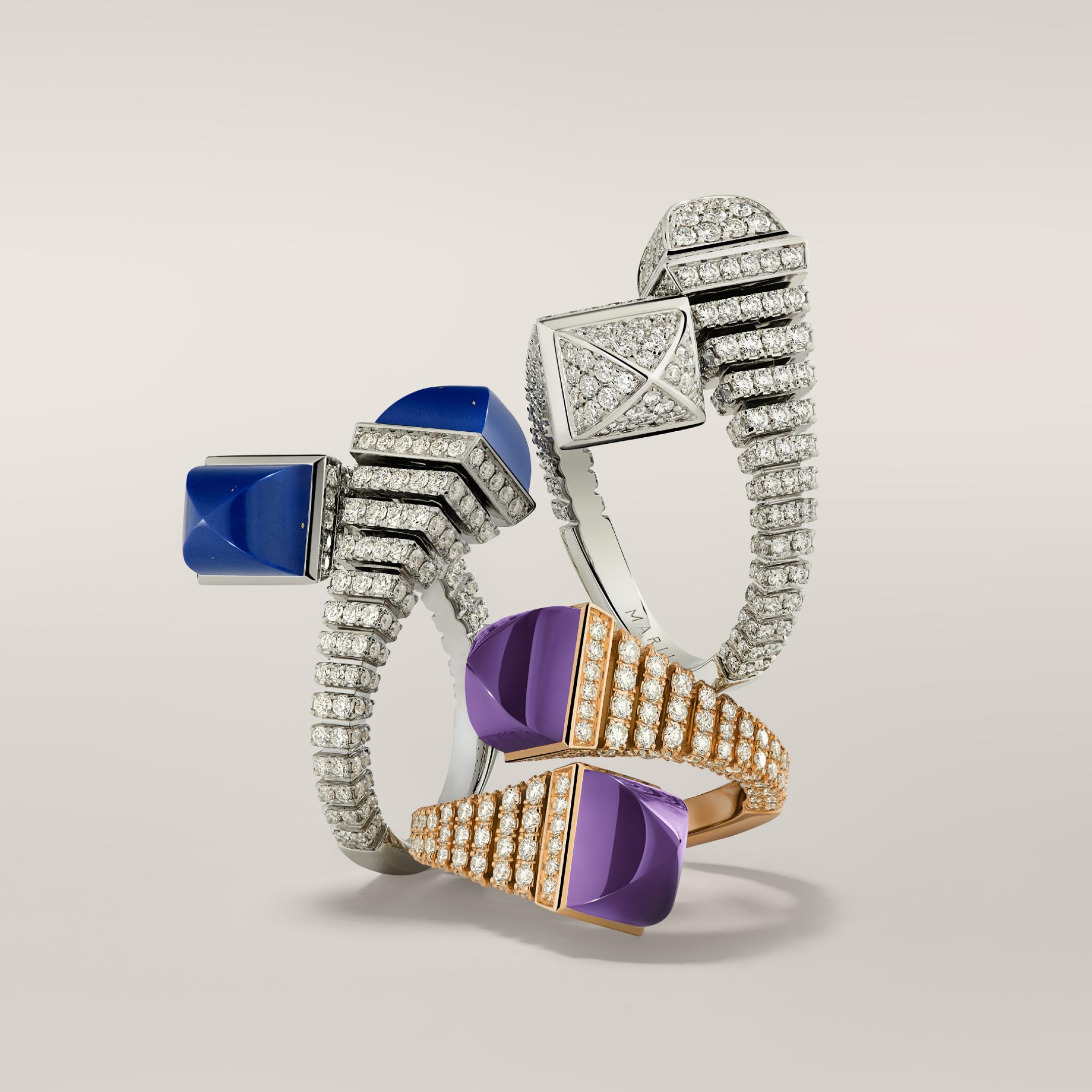 تقدّم هذه التصاميم مفهوم حديث للمجوهرات، حيث يتلاقى بريق الألماس مع ألوان الأحجار الكريمة في تناغم يعكس التباين الجميل بين القوة والنعومة. هذا المزج لا يقتصر على الجانب الجمالي فحسب، بل يعبّر عن رؤية العلامة التي تحتفي بالاختلاف وتحوّله إلى عنصر قوة.