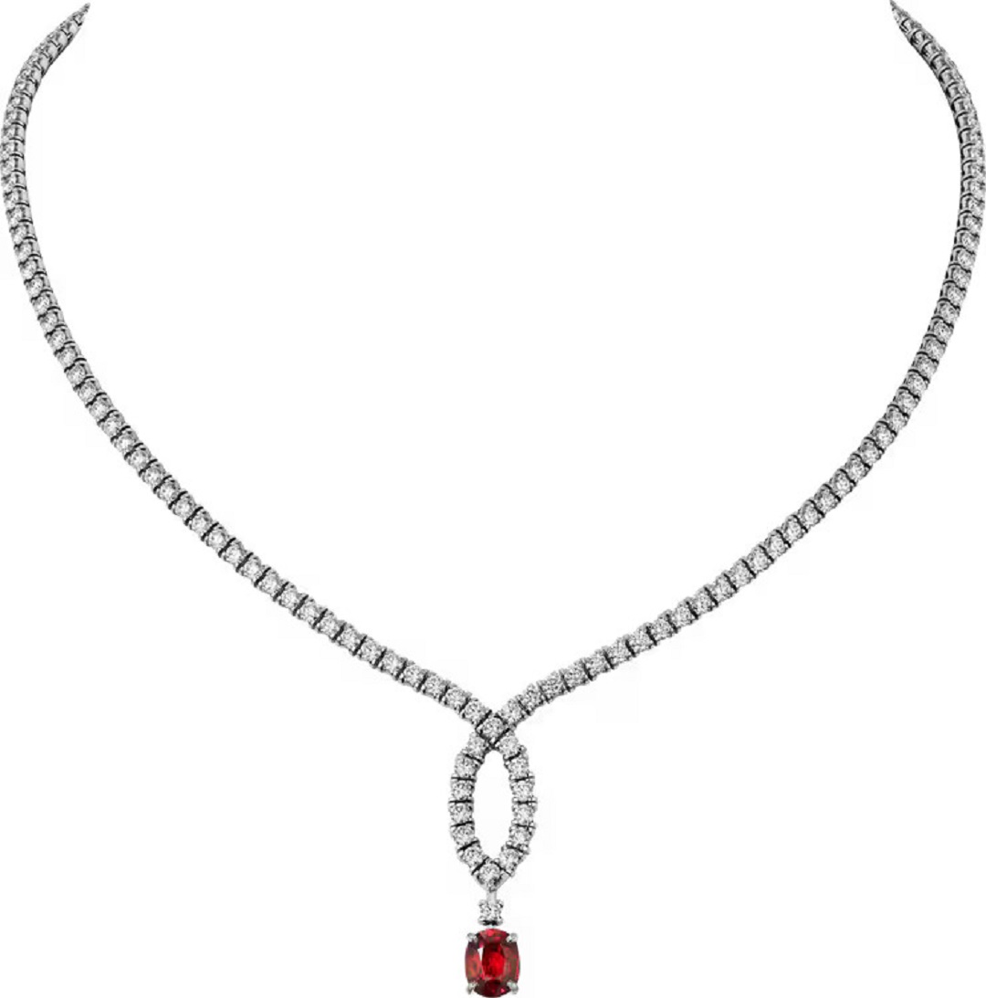 تثبت كارتييه Cartier من خلال عقد High Jewelry المرصّع بحجر روبي بيضاوي أن الفخامة الحقيقية لا تحتاج إلى تعقيد. يأتي التصميم من الذهب الأبيض عيار 18 قيراطاً، ويحتضن حجر روبي بيضاوياً بوزن يتراوح بين 1.60 و2.99 قيراط، فيما تتلألأ حوله أحجار الألماس اللامعة في تناغم يبرز جمال الحجر المركزي دون أن يطغى عليه.