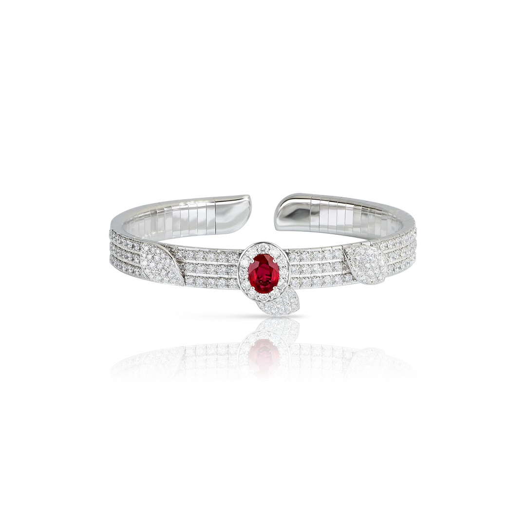 يجسّد سوار Heart to Earth من باسكال بروني Pasquale Bruni رؤية شاعرية للروبي، حيث يتحوّل هذا الحجر الناري إلى قلب نابض وسط تصميم يحمل بعداً روحانياً عميقاً. صيغ السوار من الذهب الأبيض عيار 18 قيراطاً، وتوسّطه حجر روبي بيضاوي بقياس 6×8 ملم، تحيط به ألماسات بيضاء براقة تضفي على التكوين هالة من النور والرقي.