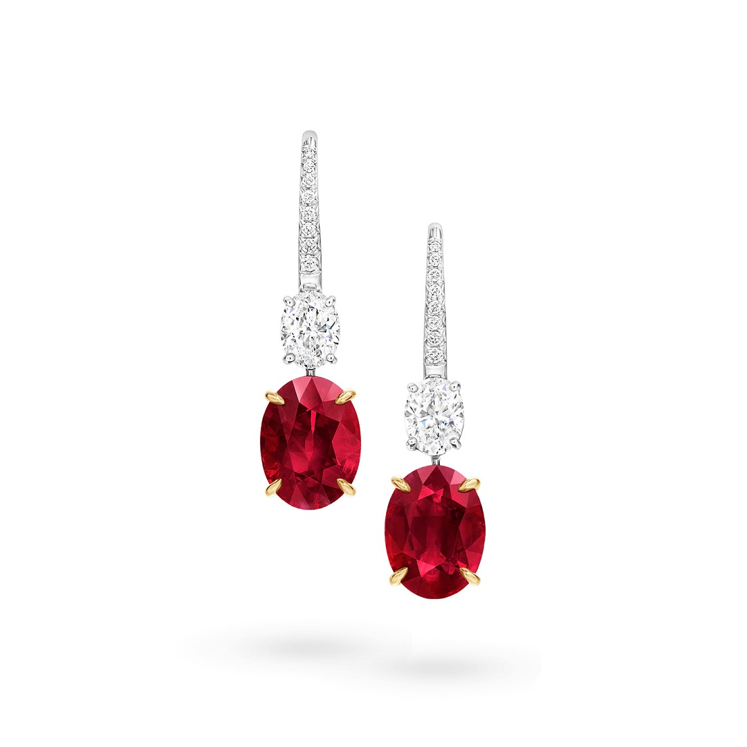 تمنح أقراط Ruby and Diamond من هاري وينستون Harry Winston الياقوت الأحمر حضوراً كلاسيكياً خالداً، يليق بالمرأة التي تؤمن بأن الأناقة الحقيقية لا ترتبط بزمان. تتألف الأقراط من حجرَي روبي بيضاويين، يحيط بهما 18 حجراً من الألماس البيضاوي والدائري اللامع، في تنسيق متوازن يجمع بين الذهب الأصفر عيار 18 قيراطاً والبلاتين.