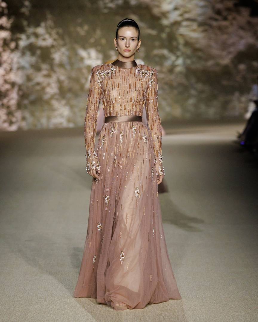 لكون المجموعة مستوحاة من رمال السعودية الذهبية، كان طبيعياً أن تطغى الألوان الترابية على عرض عدنان أكبر Adnan Akbar، تاركة انطباعاً بالفخامة أكدته المديرة الإبداعية للدار السعودية أضوى أكبر بالقصات النظيفة والتطريز المتقن، فتزين المدرج خلال اليوم الأول من أسبوع الأزياء في الرياض بباقة من الفساتين الخلابة التي ترجمت فكرة المجموعة "إرث الواحة" بشكل دقيق، وأعادتنا إلى عصر كانت فيه الحرف اليدوية هي العنصر الأقوى في صناعة الكوتور، فيكفي أن تتأملي جمال الفستان الزهري الترابي المائل للون الكاكاو المصمم بأكمام طويلة ومحبوك بتطريز متباعد يضمن الحفاظ على نعومة الطلة، لتتأكدي من نية المصممات السعوديات في وضع إبداعاتهن على خارطة الموضة العالمية.