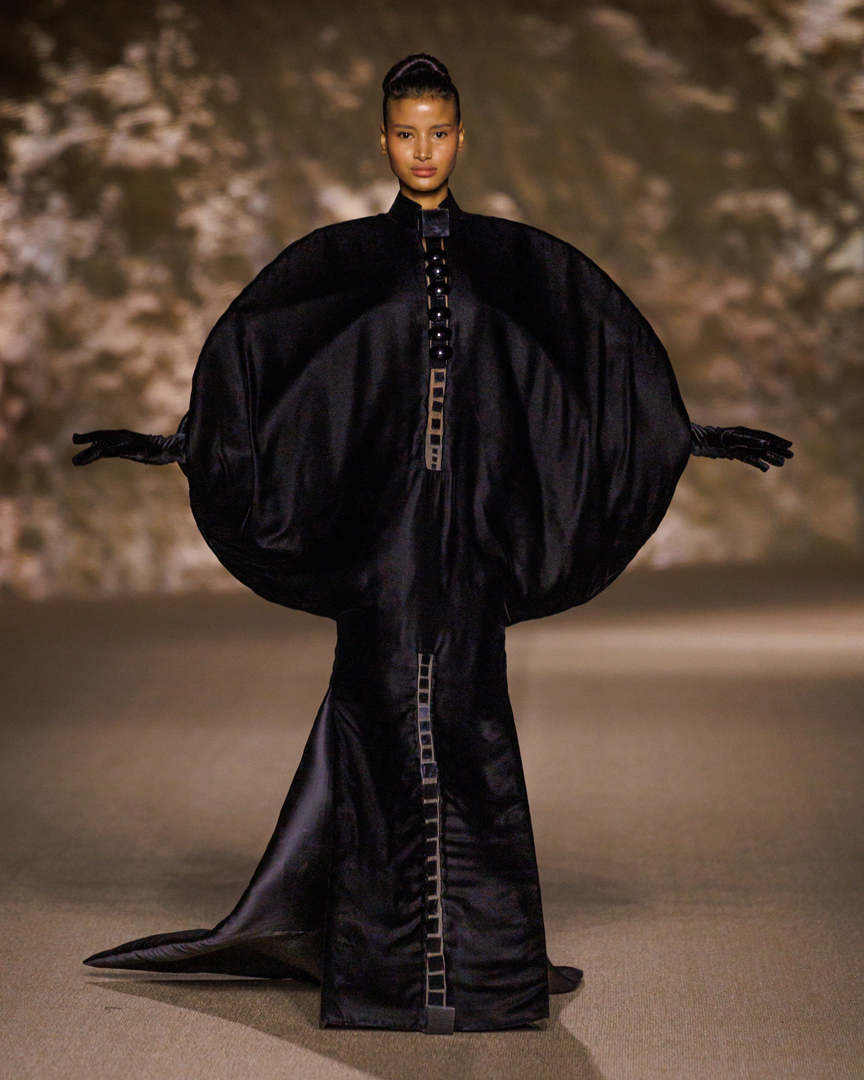 لا يمكن أن نرصد صيحات أسبوع الأزياء في الرياض من دون أن نتوقف طويلاً أمام مجموعة المصممة تيما عابد Tima Abid، ففي تمازج رائع بين الصيحات الموسمية والفن الأصيل تمايلت العارضات على المنصة بفساتين درامية استحضرت كل مرادفات الكوتور، لم يكن مجرد عرض بل حالة شعورية أرادت المصممة السعودية أن تتشاركها مع عملاء الدار، وتحت عنوان "فوضى" نسجت الحداثة بالتراث لتنتج فساتين ترتكز على جرأة الفكرة من دون التضحية بالقصات المحتشمة، فخطف أنظارنا الفستان الأسود منخفض الخصر المصمم بتوب وأكمام منتفخة موصولة بقفازات من اللون نفسه.