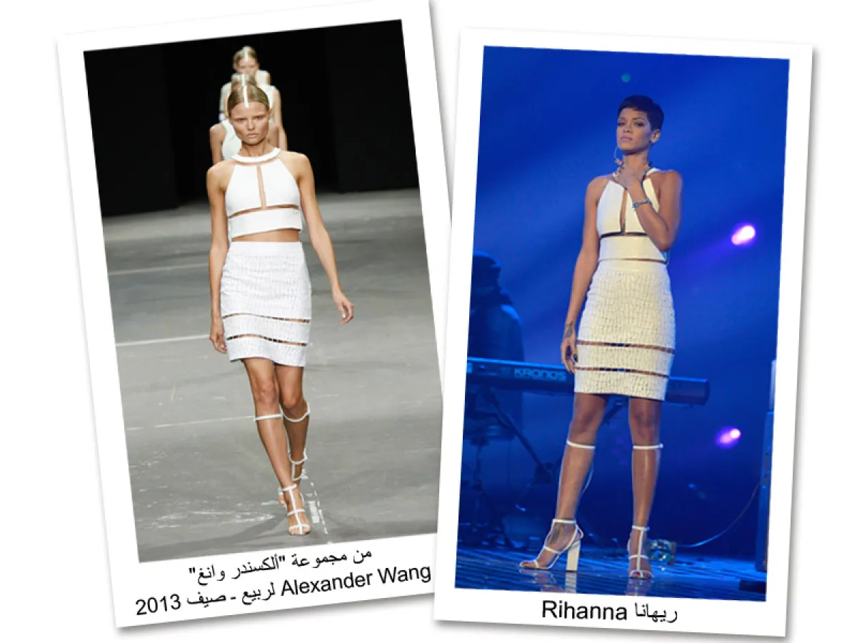 بعد مرور ثلاثة أشهر على عرض مجموعة "ألكسندر وانغ" Alexander Wang لربيع ـ صيف 2013 في سبتمبر من العام الماضي، أطلّت المغنية ريهانا Rihanna على مسرح الـ "إكس فاكتور" XFator  بفستان أبيض قصير، اختارته من هذه  المجموعة. وريهانا، التي أبهرت جمهورها بإطلالاتها الجريئة طويلاً، ارتأت أن تستنسخ إطلالة العارضة كما هي، فاختارت الحذاء نفسه، وأضافت إلى إطلالتها بعض اللمسات الجريئة، فزيّنت أصابعها بالخواتم المعدنيّة، بالإضافة إلى سوار عصريّ لافت وأقراط ذات أحجام صغيرة. فهل أحسنت ريهانا الاختيار برأيك؟ وهل كان الفستان مناسباً لجسمها؟
