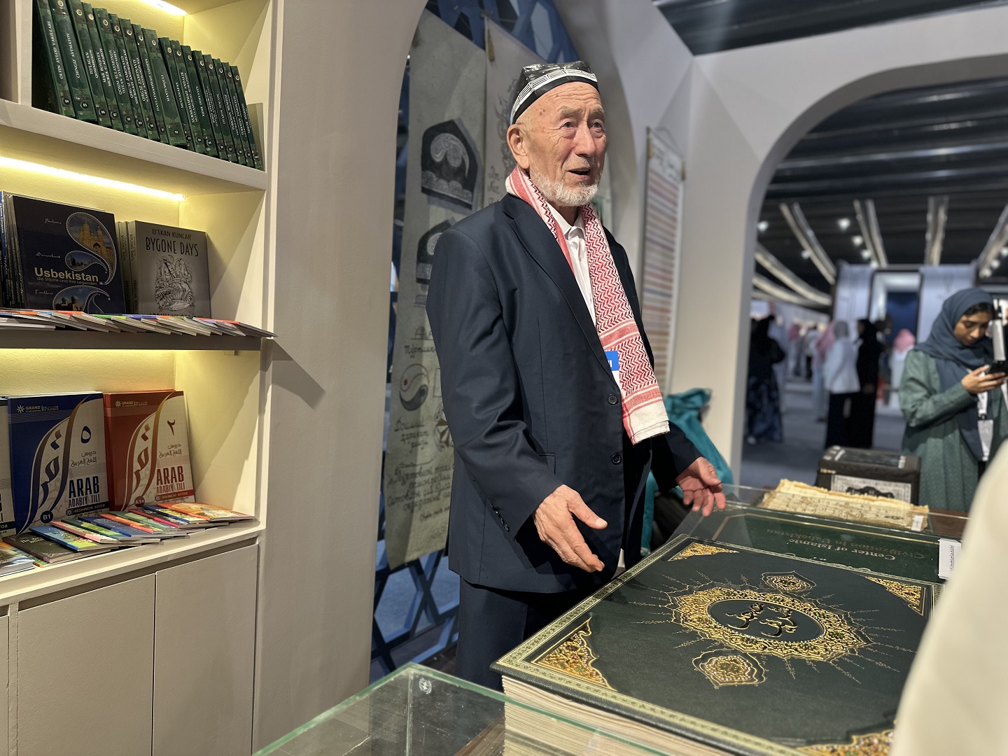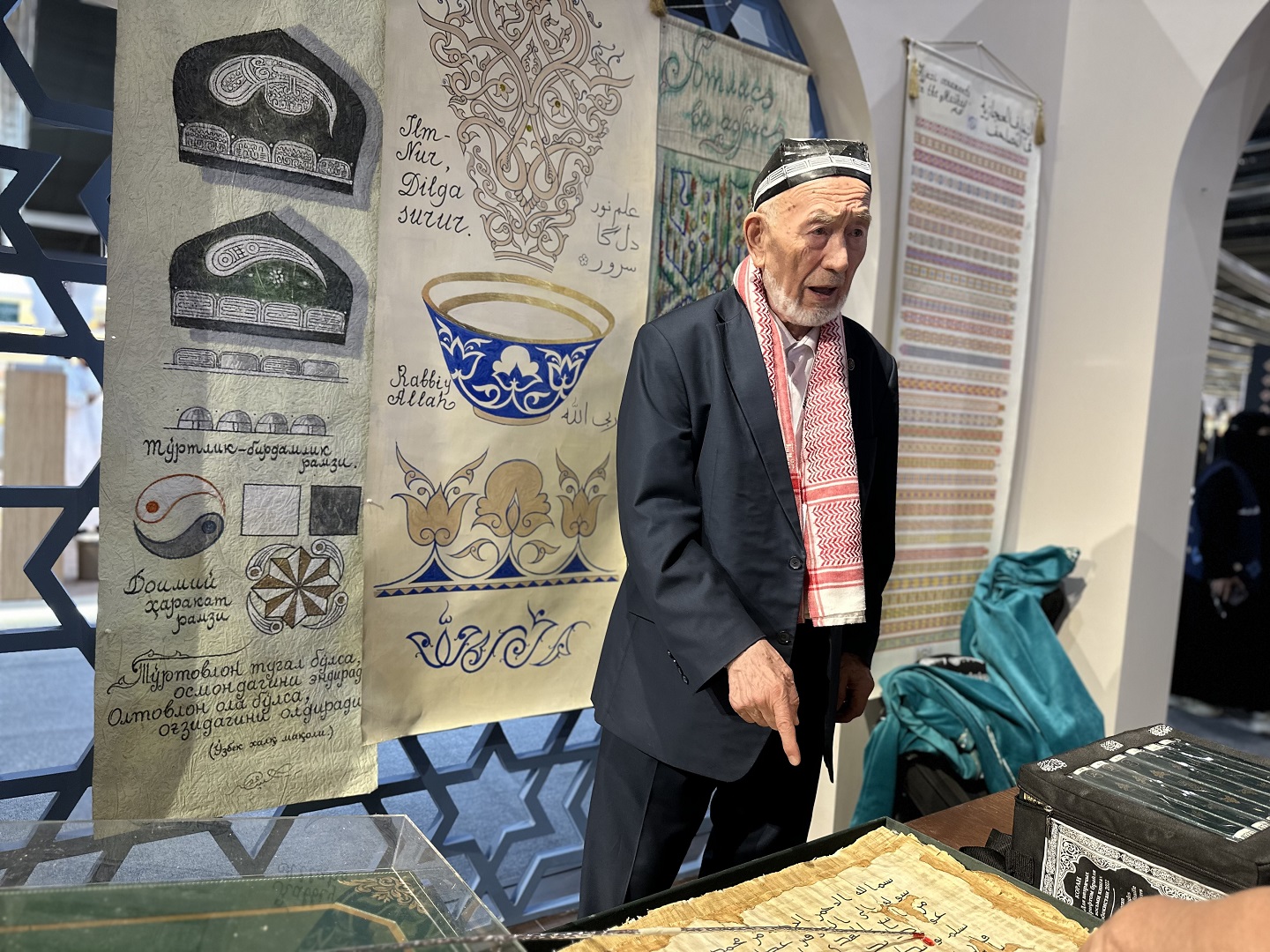 وزودنا حبيب الله صالح البخاري بمعلومات مفصلة عن المخطوطات والمستندات واللوحات التي يعرضها ضمن الجناح، مشيراً إلى أنه نسخ بخط يده أقدم نسخة من القرآن الكريم؛ وهو مصحف الخليفة عثمان بن عفان، الموجود في مركز الحضارة الإسلامية في طشقند، أوزبكستان، هذا بالإضافة إلى اللوحات التي استخدم فيها أشكالاً فنية للحروف والكلمات، ليسميها "ألف باء الزخرفة"، لا سيما الكلمات ذات الدلالات الدينية والإسلامية تحديداً، كما أطلعنا على لوحة ضخمة؛ جمع فيها ما يقارب الـ 50 نوعاً من النقوش التي استخدمت في تزيين بدايات السور القرآنية".