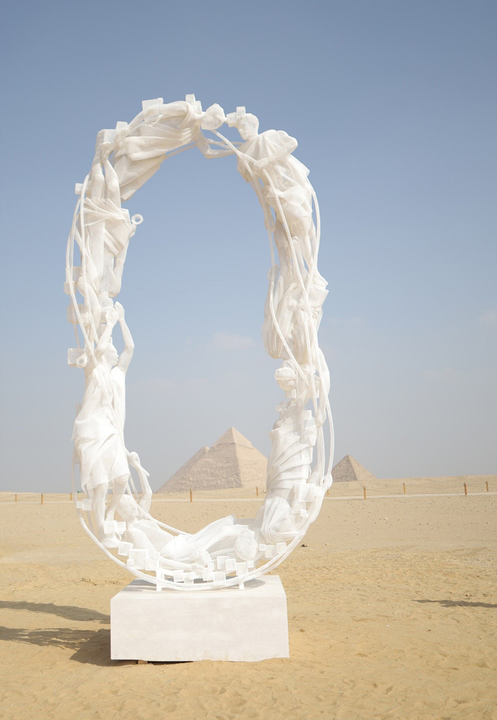 هو عملٌ فنِّي، يُعبِّر عن لحظةِ الصفر التي ينتهي فيها العالمُ كما عرفناه، ويبدأ عالمٌ جديدٌ، تحكمه قواعدُ مختلفةٌ. إطارُه الأبيض، يُشبه في شكله «الشنة»، وهي جسمٌ دائري، يُحيط بأسماءِ الملوك في الهيروغليفيَّة، وكلَّما اقتربت من المجسَّم، وجدت أشكالاً لأشخاصٍ وأدواتٍ، تُمثِّل حالةَ التغييرِ والتطوُّرِ التي يرمزُ لها فريقُ Recycled Group.