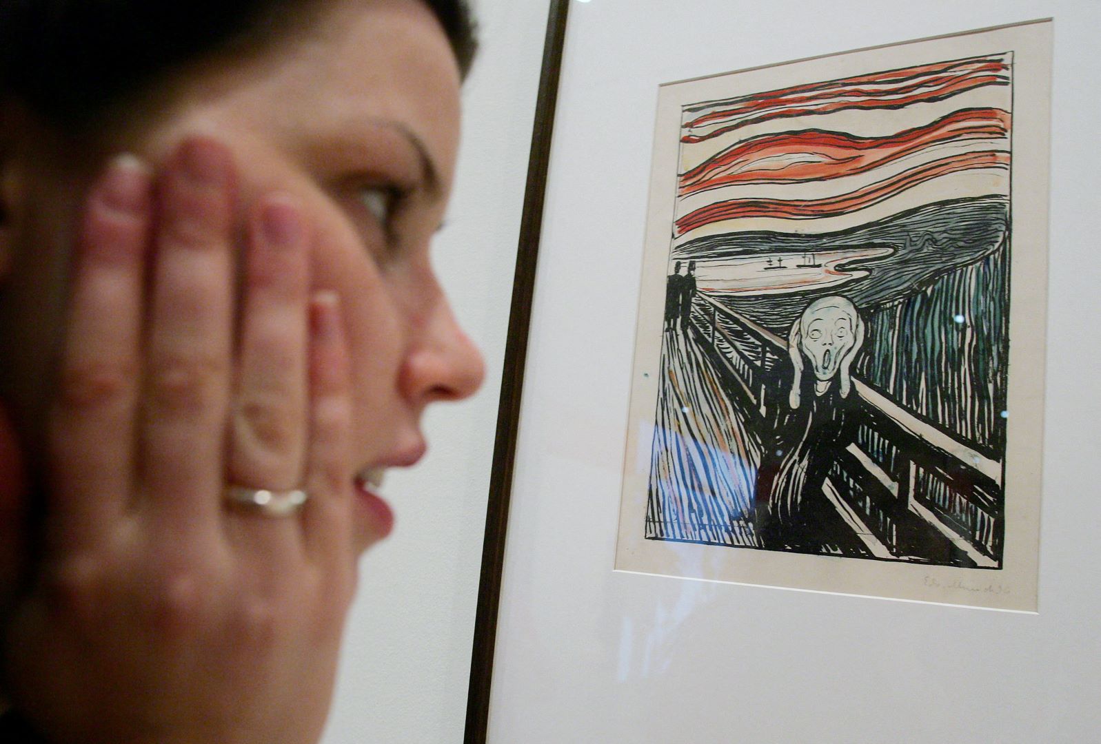 مادلين ويلسون من المعرض الوطني لفيكتوريا تتفقد نسخة إدفار مونك الشهيرة "الصرخة"في ملبورن بتاريخ 12 أكتوبر 2004. المصدر: (Photo by WILLIAM WEST / AFP)