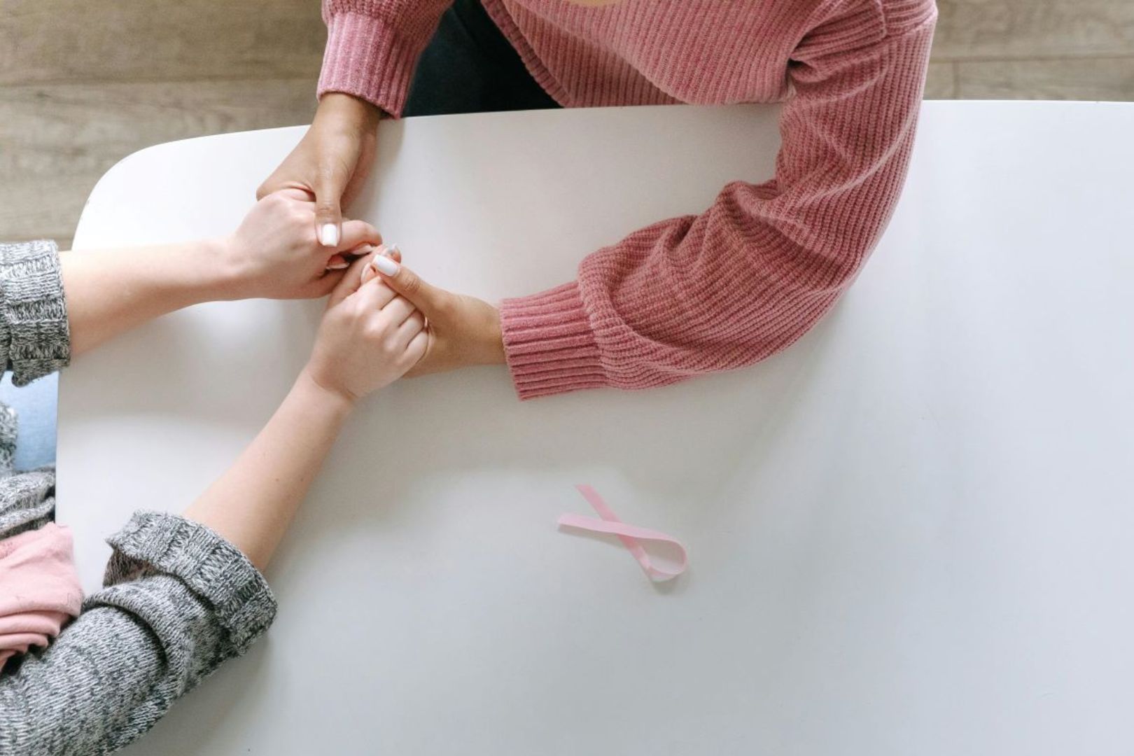 اختصاصية تدعم إحدى مصابات سرطان الثدي وتمسك بيديها وبجوارهما على الطاولة الشريط الوردي أيقونة سرطان الثدي حيث إن التوعية بالكشف المبكر من عوامل الشفاء من مرض سرطان الثدي
