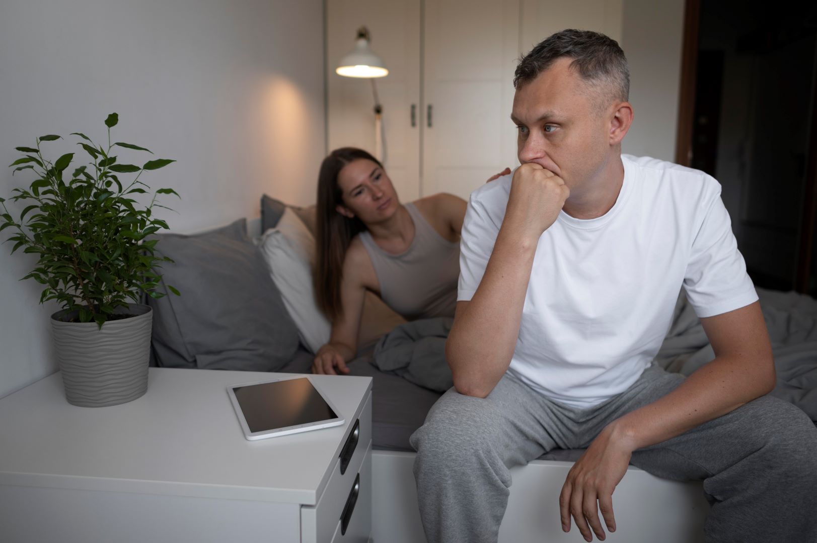زوجة تجلس على السرير وتنظر لزوجها الصامت محاولة أن تتحدث معه حيث الصمت في العلاقة الزوجية قد يكون علاجاً عندما يُستخدم كأداة لتهدئة النفوس - المصدر: freepik
