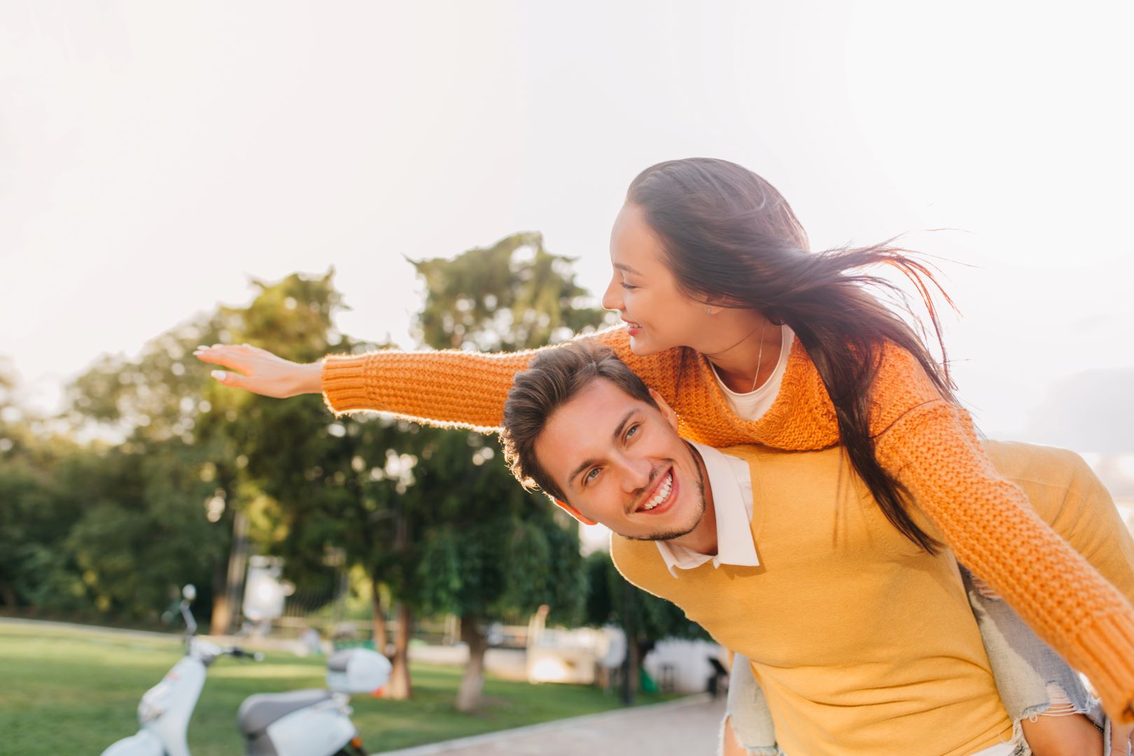 زوجة تحتضن ظهر زوجها وهو يمسك يديها وهما يبتسمان