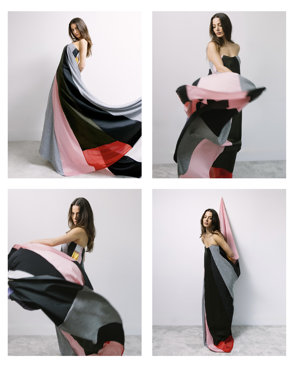 تعكسُ المجموعةُ الأخيرةُ التوتُّرَ العاطفي، وتعقيدَ العالمِ الذي نعيشُ فيه اليوم. أردتُ أن أستكشفَ كيف تتطوَّرُ المشاعرُ حين نواجه تناقضاتٍ مستمرَّةً في حياتنا اليوميَّة. تصبحُ لوحةُ الألوانِ أساسَ هذه الفكرة. الأسودُ، يُشكِّل قاعدةً، تُثبِّت المجموعةَ في الظلمةِ والسكون، بينما تظهرُ الألوانُ الجريئةُ بوصفها تعبيراً عن العاطفة، في حين يُقدِّم الأحمرُ الفاقعُ الإلحاحَ والحدَّة، بينما يرمزُ الوردي والأبيضُ إلى اللطفِ، والتعاطفِ، والنورِ الذي نستمرُّ في البحثِ عنه، أمَّا الفضِّي، فينسجُ عبر المجموعةِ كتذكيرٍ بالمرونة. يصبحُ رمزاً للدروعِ، والقوَّةِ، والعزمِ الهادئ واللازمِ للعبورِ عبر عدمِ اليقين برشاقةٍ.